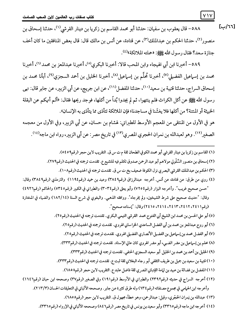 ٥٨٩ - أخبرنا ابن أبي الهيجاء وابن المحب قالا: أخبرنا البكري (¬٥)، أخبرنا عبد المعز بن محمد (¬٦)، أخبرنا محمد بن إسماعيل الفضيلي (¬٧)، أخبرنا مُحلَّم بن إسماعيل (¬٨)، أخبرنا الخليل بن أحمد السجزي (¬٩)، أبانا محمد بن إسحاق السراج، حدثنا قتيبة بن سعيد (¬١٠)، حدثنا المفضل (¬١١)، عن ابن جريج، عن أبي الزبير، عن جابر قال: نهى رسول اللَّه -صلى اللَّه عليه وسلم- عن أكل الكراث فلم ينتهوا، ثم لم يجدوا بُدًا من أكلها، فوجد ريحها فقال: "ألم أنهكم عن البقلة الخبيثة أو المنتنة؟ من أكلها فلا يغشَنا في مساجدنا؛ فإن الملائكة تتأذى مما يتأذى به الإنسان".