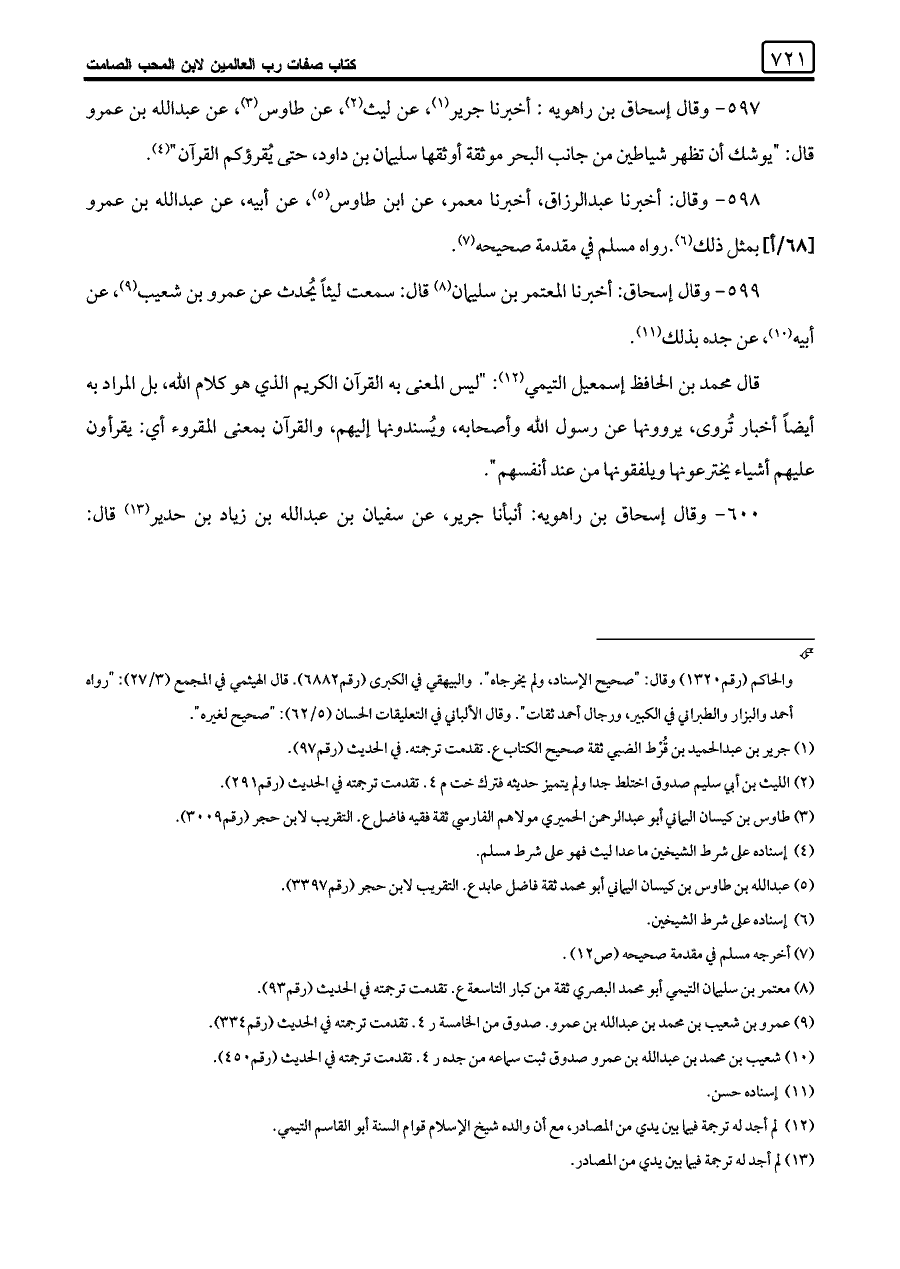 ٥٩٧ - وقال إسحاق بن راهويه: أخبرنا جرير (¬١)، عن ليث (¬٢)، عن طاوس (¬٣)، عن عبد اللَّه بن عمرو قال: "يوشك أن تظهر شياطين من جانب البحر موثقة أوثقها سليمان بن داود، حتى يُقرؤكم القرآن" (¬٤).