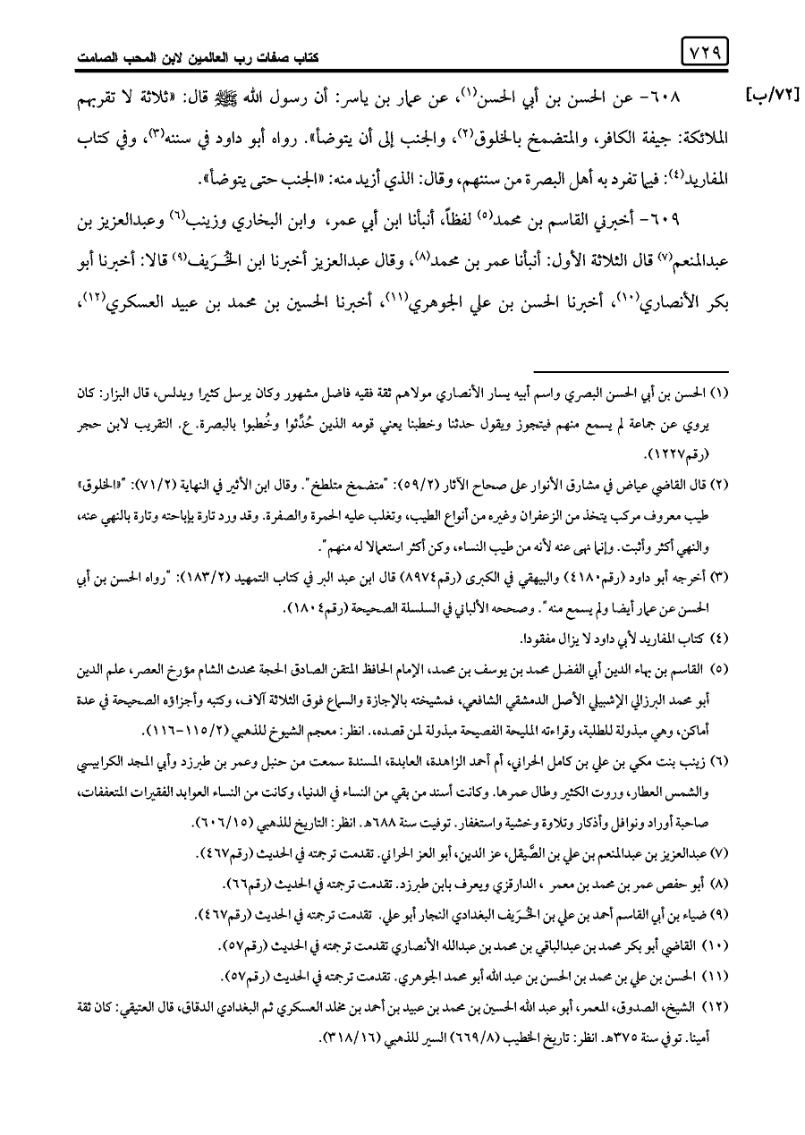 ٦٠٨ - عن الحسن بن أبي الحسن (¬١)، عن عمار بن ياسر: أن رسول اللَّه -صلى اللَّه عليه وسلم- قال: "ثلاثة لا تقربهم الملائكة: جيفة الكافر، والمتضمخ بالخلوق (¬٢)، والجنب إلى أن يتوضأ". رواه أبو داود في سننه (¬٣)، وفي كتاب المفاريد (¬٤): فيما تفرد به أهل البصرة من سننهم، وقال: الذي أزيد منه: "الجنب حتى يتوضأ".