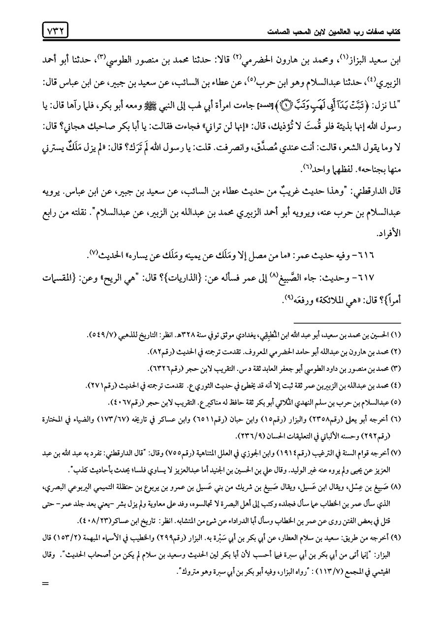 بن سعيد البزاز (¬١)، ومحمد بن هارون الحضرمي (¬٢) قالا: حدثنا محمد بن منصور الطوسي (¬٣)، حدثنا أبو أحمد الزبيري (¬٤)، حدثنا عبد السلام وهو ابن حرب (¬٥)، عن عطاء بن السائب، عن سعيد بن جبير، عن ابن عباس قال: "لما نزل: {تَبَّتْ يَدَا أَبِي لَهَبٍ وَتَبَّ (١)} [المسد] جاءت امرأة أبي لهب إلى النبي -صلى اللَّه عليه وسلم- ومعه أبو بكر، فلما رآها قال: يا رسول اللَّه إنها بذيئة فلو قُمتَ لا تُؤذيك، قال: "إنها لن تراني" فجاءت فقالت: يا أبا بكر صاحبك هجاني؟ قال: لا وما يقول الشعر، قالت: أنت عندي مُصدَّق، وانصرفت. قلت: يا رسول اللَّه لَمَ تَرَك؟ قال: "لم يزل مَلَكٌ يسترني منها بجناحه". لفظهما واحد (¬٦).