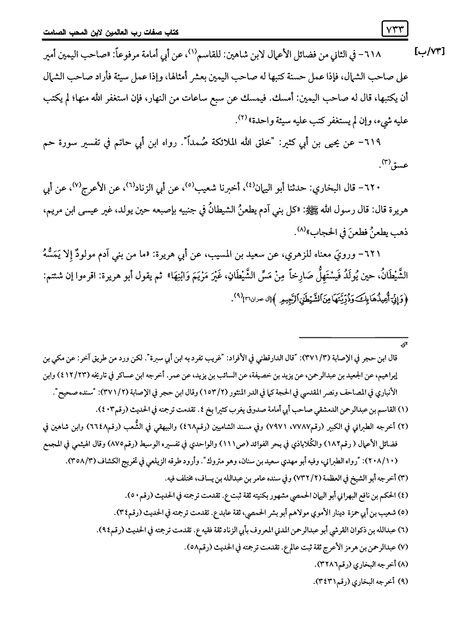 ٦١٨ - في الثاني من فضائل الأعمال لابن شاهين: للقاسم (¬١)، عن أبي أمامة مرفوعًا: "صاحب اليمين أمير على صاحب الشمال، فإذا عمل حسنة كتبها له صاحب اليمين بعشر أمثالها، وإذا عمل سيئة فأراد صاحب الشمال أن يكتبها، قال له صاحب اليمين: أمسك. فيمسك عن سبع ساعات من النهار، فإن استغفر اللَّه منها؛ لم يكتب عليه شيء، وإن لم يستغفر كتب عليه سيئة واحدة" (¬٢).