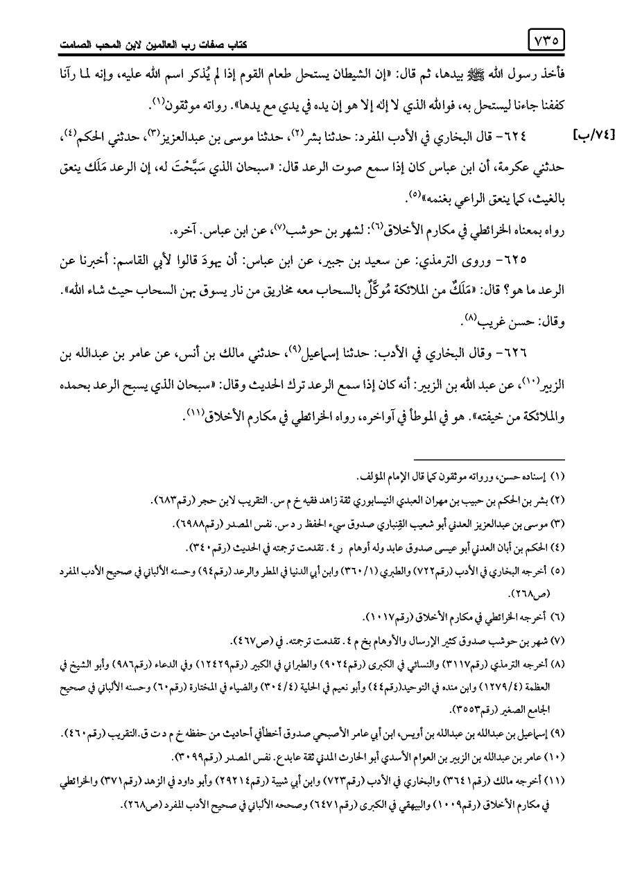 ٦٢٤ - قال البخاري في الأدب المفرد: حدثنا بشر (¬٢)، حدثنا موسى بن عبد العزيز (¬٣)، حدثني الحكم (¬٤)، حدثني عكرمة، أن ابن عباس كان إذا سمع صوت الرعد قال: "سبحان الذي سَبَّحْت له، إن الرعد مَلَك ينعق بالغيث، كما ينعق الراعي بغنمه" (¬٥).