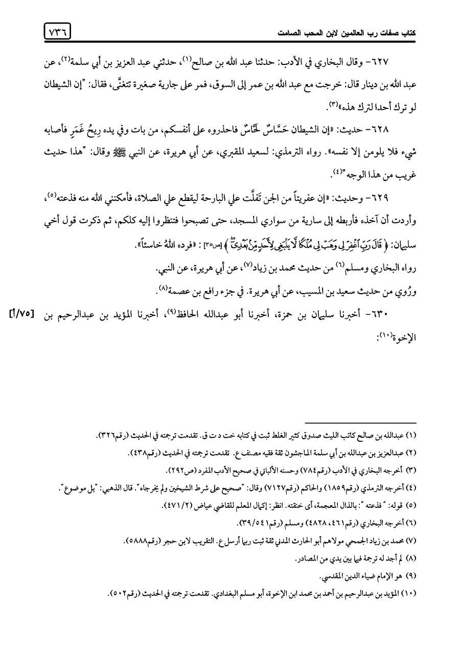 ٦٢٧ - وقال البخاري في الأدب: حدثنا عبد اللَّه بن صالح (¬١)، حدثني عبد العزيز بن أبي سلمة (¬٢)، عن عبد اللَّه بن دينار قال: خرجت مع عبد اللَّه بن عمر إلى السوق، فمر على جارية صغيرة تتغنَّى، فقال: "إن الشيطان لو ترك أحدا لترك هذه" (¬٣).