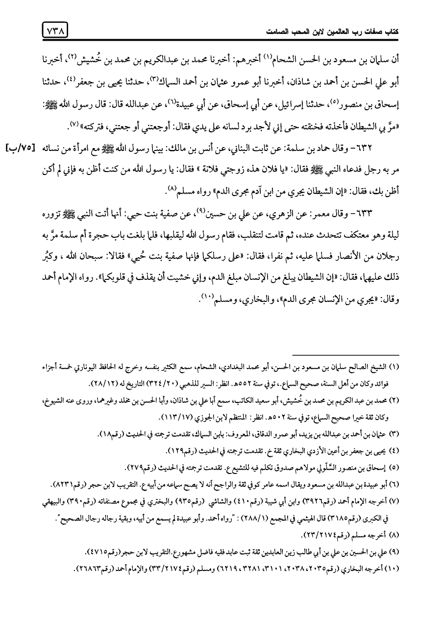 ٦٣٢ - وقال حماد بن سلمة: عن ثابت البناني، عن أنس بن مالك: بينما رسول اللَّه -صلى اللَّه عليه وسلم- مع امرأة من نسائه مر به رجل فدعاه النبي -صلى اللَّه عليه وسلم- فقال: "يا فلان هذه زوجتي فلانة" فقال: يا رسول اللَّه من كنت أظن به فإني لم أكن أظن بك، فقال: "إن الشيطان يجري من ابن آدم مجرى الدم" رواه مسلم (¬٨).