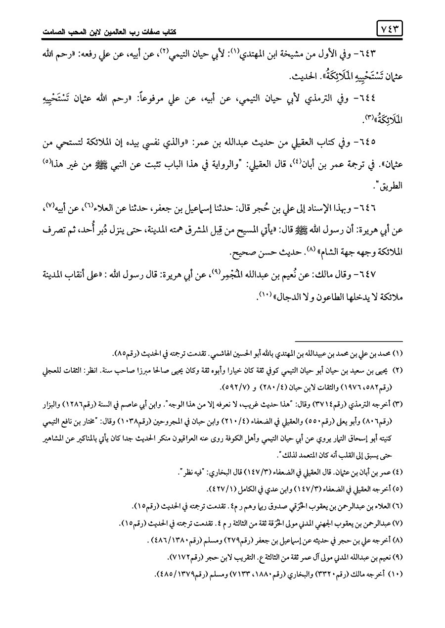 ٦٤٣ - وفي الأول من مشيخة ابن المهتدي (¬١): لأبي حيان التيمي (¬٢)، عن أبيه، عن علي رفعه: "رحم اللَّه عثمان تَسْتَحْيِيهِ المَلائِكَةُ". الحديث.
