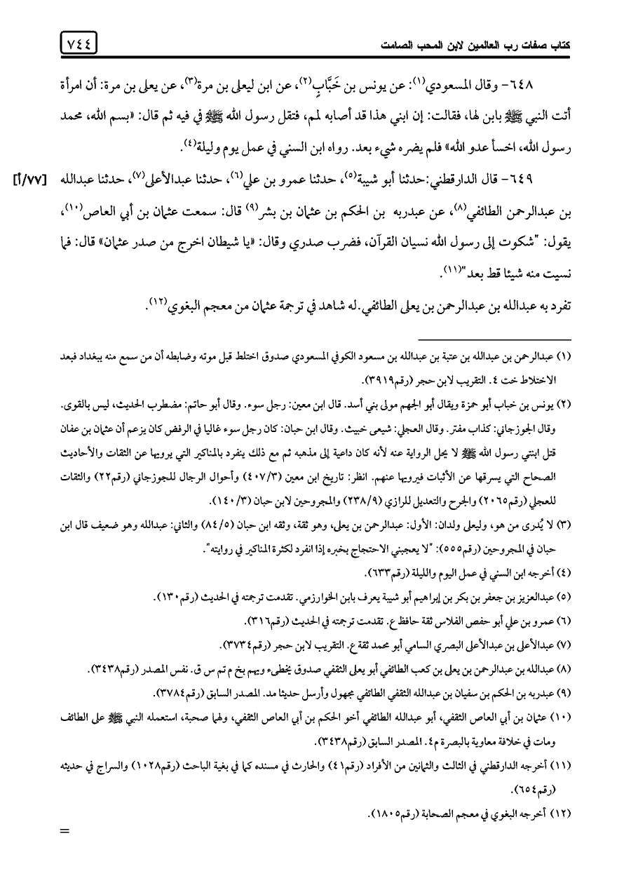 (¬١) عبد الرحمن بن عبد اللَّه بن عتبة بن عبد اللَّه بن مسعود الكوفي المسعودي صدوق اختلط قبل موته وضابطه أن من سمع منه ببغداد فبعد الاختلاط خت ٤. التقريب لابن حجر (رقم ٣٩١٩).