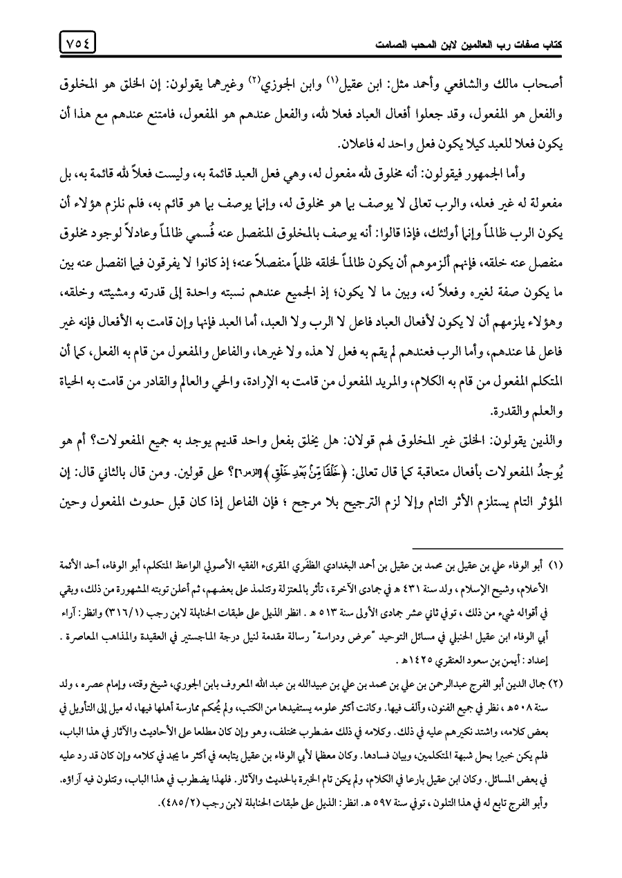 وأما الجمهور فيقولون: أنه مخلوق للَّه مفعول له، وهي فعل العبد قائمة به، وليست فعلًا للَّه قائمة به، بل مفعولة له غير فعله، والرب تعالى لا يوصف بها هو مخلوق له، وإنما يوصف بها هو قائم به، فلم نلزم هؤلاء أن يكون الرب ظالمًا وإنما أولئك، فإذا قالوا: أنه يوصف بالمخلوق المنفصل عنه فُسمي ظالمًا وعادلًا لوجود مخلوق منفصل عنه خلقه، فإنهم ألزموهم أن يكون ظالمًا خلقه ظلمًا منفصلًا عنه؛ إذ كانوا لا يفرقون فيها انفصل عنه بين ما يكون صفة لغيره وفعلًا له، وبين ما لا يكون؛ إذ الجميع عندهم نسبته واحدة إلى قدرته ومشيئته وخلقه، وهؤلاء يلزمهم أن لا يكون الأفعال العباد فاعل لا الرب ولا العبد، أما العبد فإنها وإن قامت به الأفعال فإنه غير فاعل لها عندهم، وأما الرب فعندهم لم يقم به فعل لا هذه ولا غيرها، والفاعل والمفعول من قام به الفعل، كما أن المتكلم المفعول من قام به الكلام، والمريد المفعول من قامت به الإرادة، والحي والعالم والقادر من قامت به الحياة والعلم والقدرة.