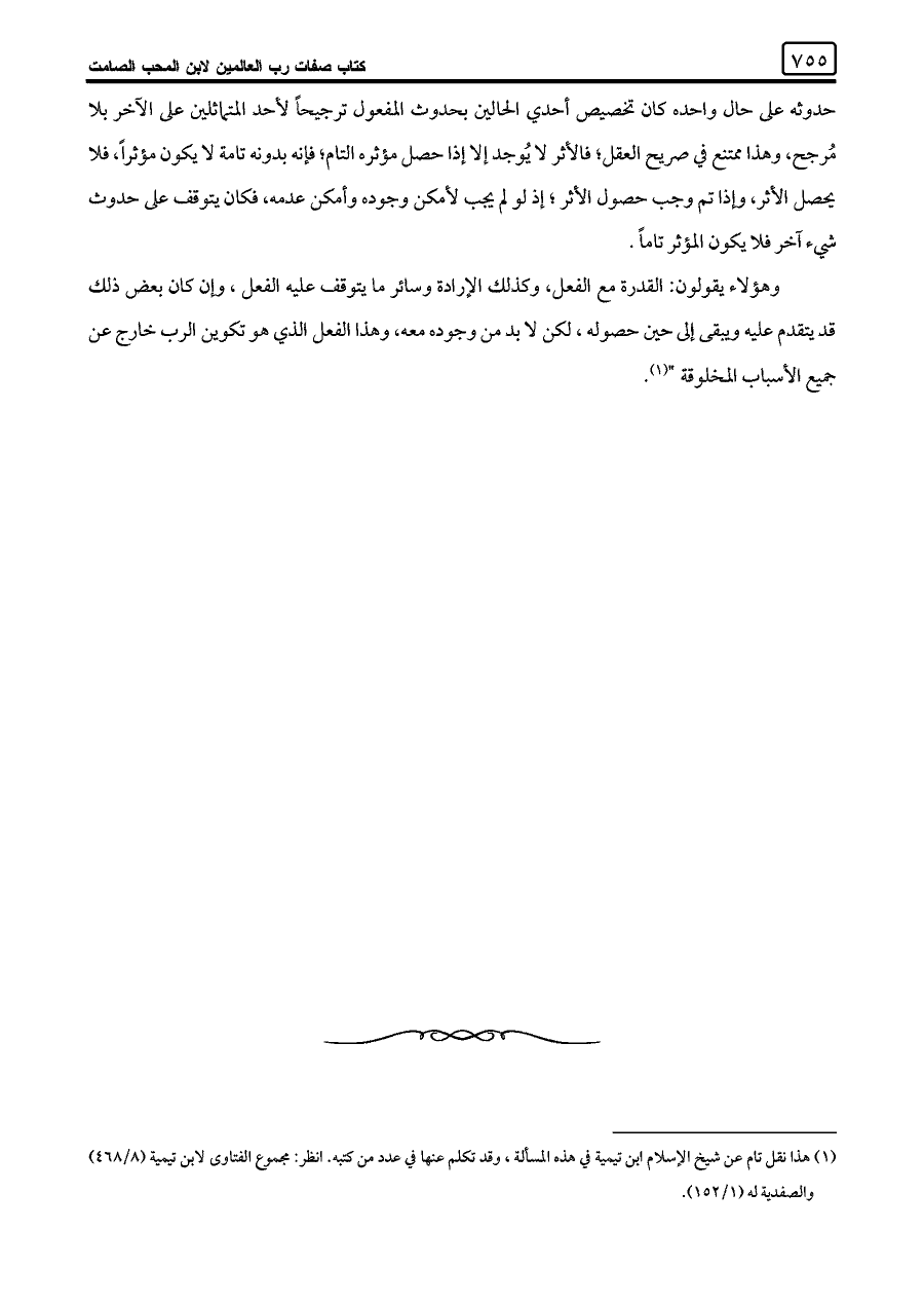 حدوثه على حال واحده كان تخصيص أحدي الحالين بحدوث المفعول ترجيحًا لأحد المتماثلين على الآخر بلا مُرجح، وهذا ممتنع في صريح العقل؛ فالأثر لا يُوجد إِلا إذا حصل مؤثره التام؛ فإنه بدونه تامة لا يكون مؤثرًا، فلا يحصل الأثر، وإذا تم رجب حصول الأثر؛ إذ لو لم يجب لأمكن وجوده وأمكن عدمه، فكان يتوقف على حدوث شيء آخر فلا يكون المؤثر تامًا.