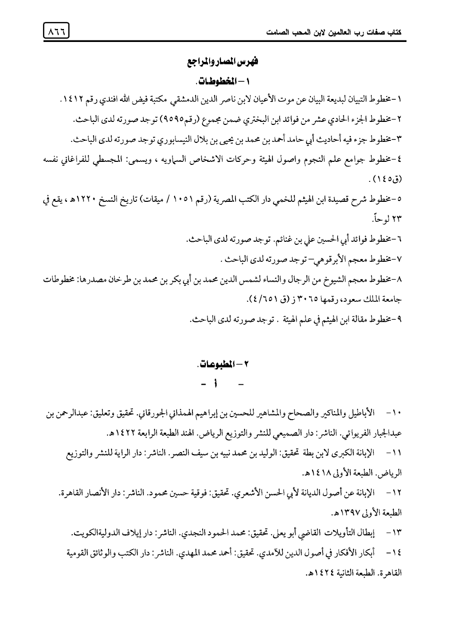 ١١ - الإبانة الكبرى لابن بطة تحقيق: الوليد بن محمد نبيه بن سيف النصر. الناشر: دار الراية للنشر والتوزيع الرياض. الطبعة الأولى ١٤١٨ هـ.