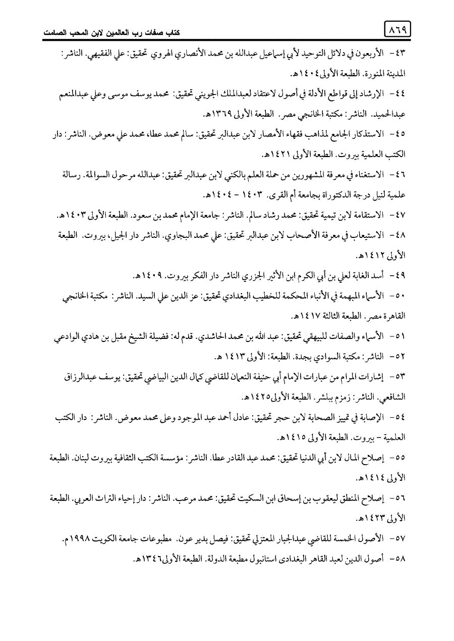 ٤٤ - الإرشاد إلى قواطع الأدلة في أصول لاعتقاد لعبد الملك الحويني تحقيق: محمد يوسف موسى وعلي عبد المنعم عبد الحميد. الناشر: مكتبة الخانجي مصر. الطبعة الأولى ١٣٦٩ هـ.