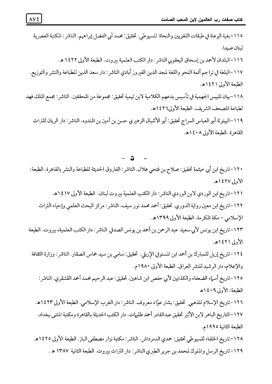 ١٢٠ - تاريخ ابن أبي خيثمة تحقيق: صلاح بن فتحي هلال. الناشر: الفاروق الحديثة للطباعة والنشر بالقاهرة. الطبعة: الأولى ١٤٢٧ هـ.
