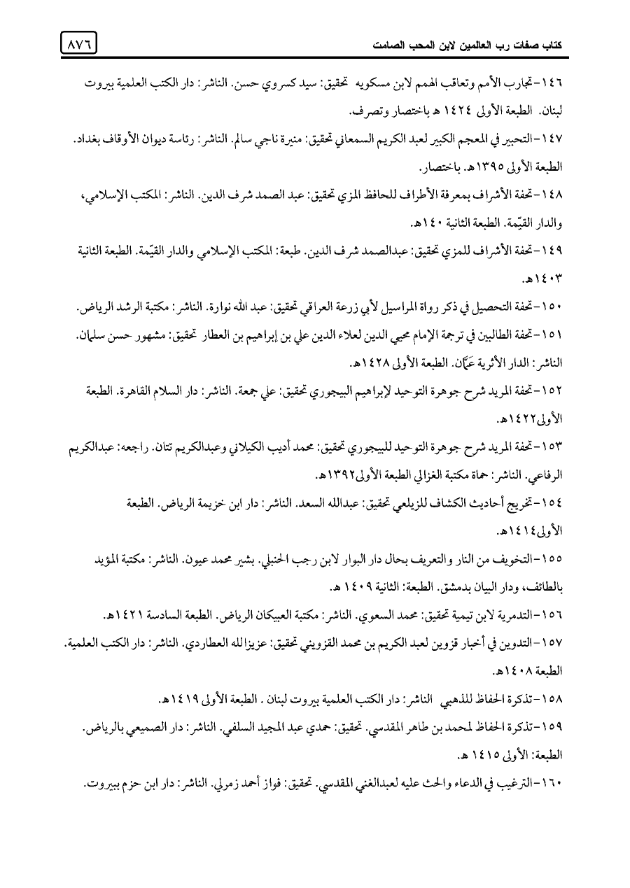 ١٤٧ - التحبير في المعجم الكبير لعبد الكريم السمعاني تحقيق: منيرة ناجي سالم. الناشر: رئاسة ديوان الأوقاف بغداد. الطبعة الأولى ١٣٩٥ هـ. باختصار.