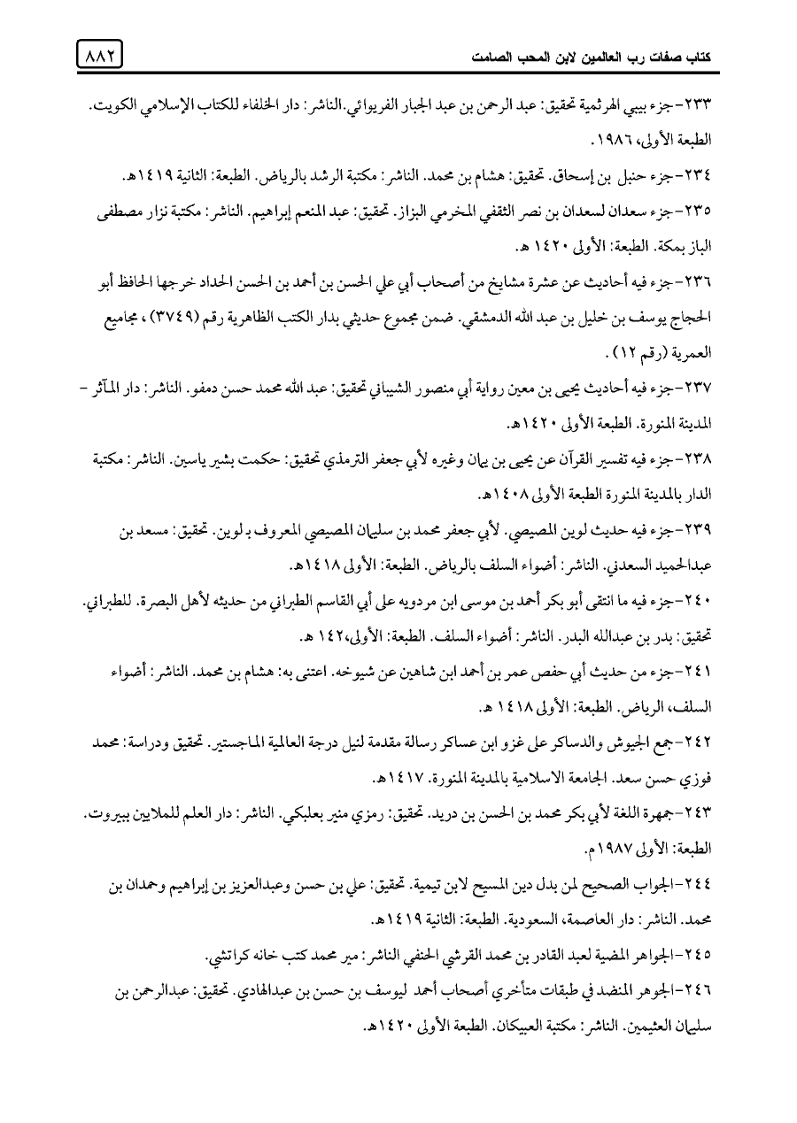 ٢٣٧ - جزء فيه أحاديث يحيى بن معين رواية أبي منصور الشيباني تحقيق: عبد اللَّه محمد حسن دمفو. الناشر: دار المآثر - المدينة المنورة. الطبعة الأولى ١٤٢٠ هـ.