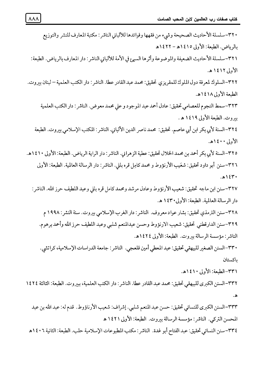 ٣٢٤ - السنة لأبي بكر ابن أبي عاصم، تحقيق: محمد ناصر الدين الألباني. الناشر: المكتب الإسلامي بيروت. الطبعة الأولى ١٤٠٠ هـ.