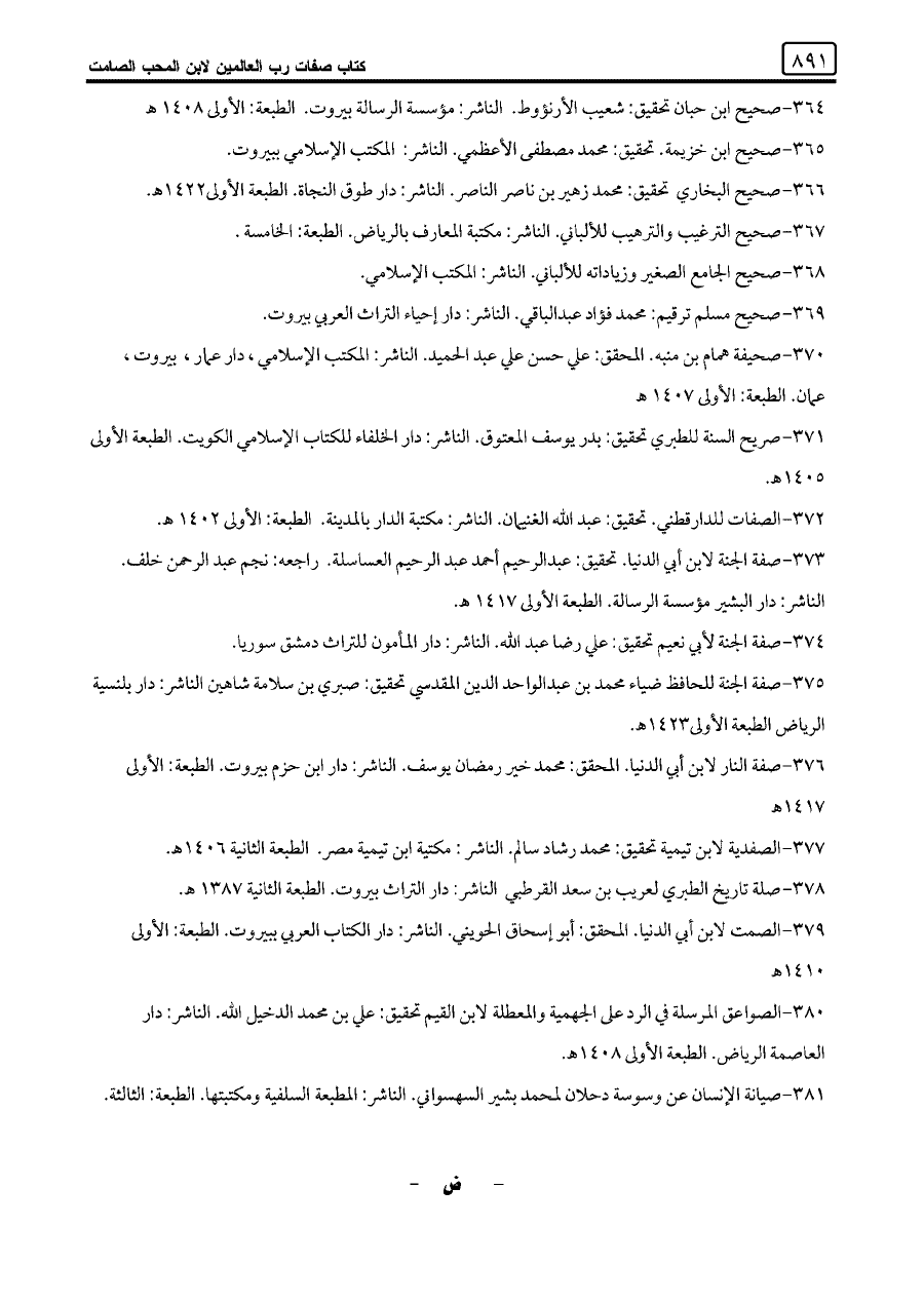 ٣٨٠ - الصواعق المرسلة في الرد على الجهمية والمعطلة لابن القيم تحقيق: علي بن محمد الدخيل اللَّه. الناشر: دار العاصمة الرياض. الطبعة الأولى ١٤٠٨ هـ.