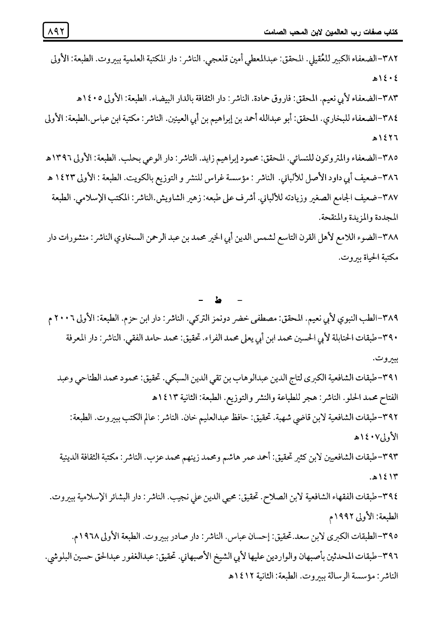 ٣٩٦ - طبقات المحدثين بأصبهان والواردين عليها لأبي الشيخ الأصبهاني. تحقيق: عبد الغفور عبد الحق حسين البلوشي. الناشر: مؤسسة الرسالة ببيروت. الطبعة: الثانية ١٤١٢ هـ.