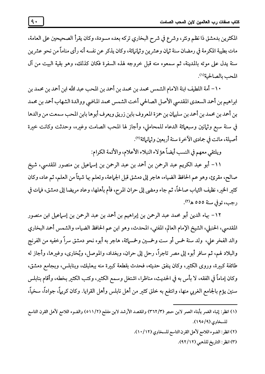 ١٢ - بهاء الدين أبو محمد عبد الرحمن بن إبراهيم بن أحمد بن عبد الرحمن بن إسماعيل ابن منصور المقدسي، الحنبلي، الشيخ الإمام العالم، المفتي، المحدث، وهو ابن عم الحافظ الضياء، والشمس أحمد البخاري والد الفخر علي، ولد سنة خمس أو ست وخمسين وخمسمائة، هاجر به أبوه نحو دمشق سرة وخفيه من الفرنج والبلاد لهم، ثم سافر أبوه إلى مصر تاجرًا، رحل إلى حران، وبغداد، والموصل، وبُخاري، وغيرها، وأجاز له طائفة كبيرة، وروى الكثير، وكان ينفق حديثه، فحدث بقطعة كبيرة منه ببعلبك، وبنابلس، وبجامع دمشق، وكان إمامًا في الفقه، لا بأس به في الحديث، مناظرا، اشتغل وسمع الكثير، وكتب الكثير بخطه، وأقام بنابلس سنين يؤم بالجامع الغربي منها، وانتفع به خلق كثير من أهل نابلس وأهل القرايا. وكان كريمًا، جوادًا، سخيًا،