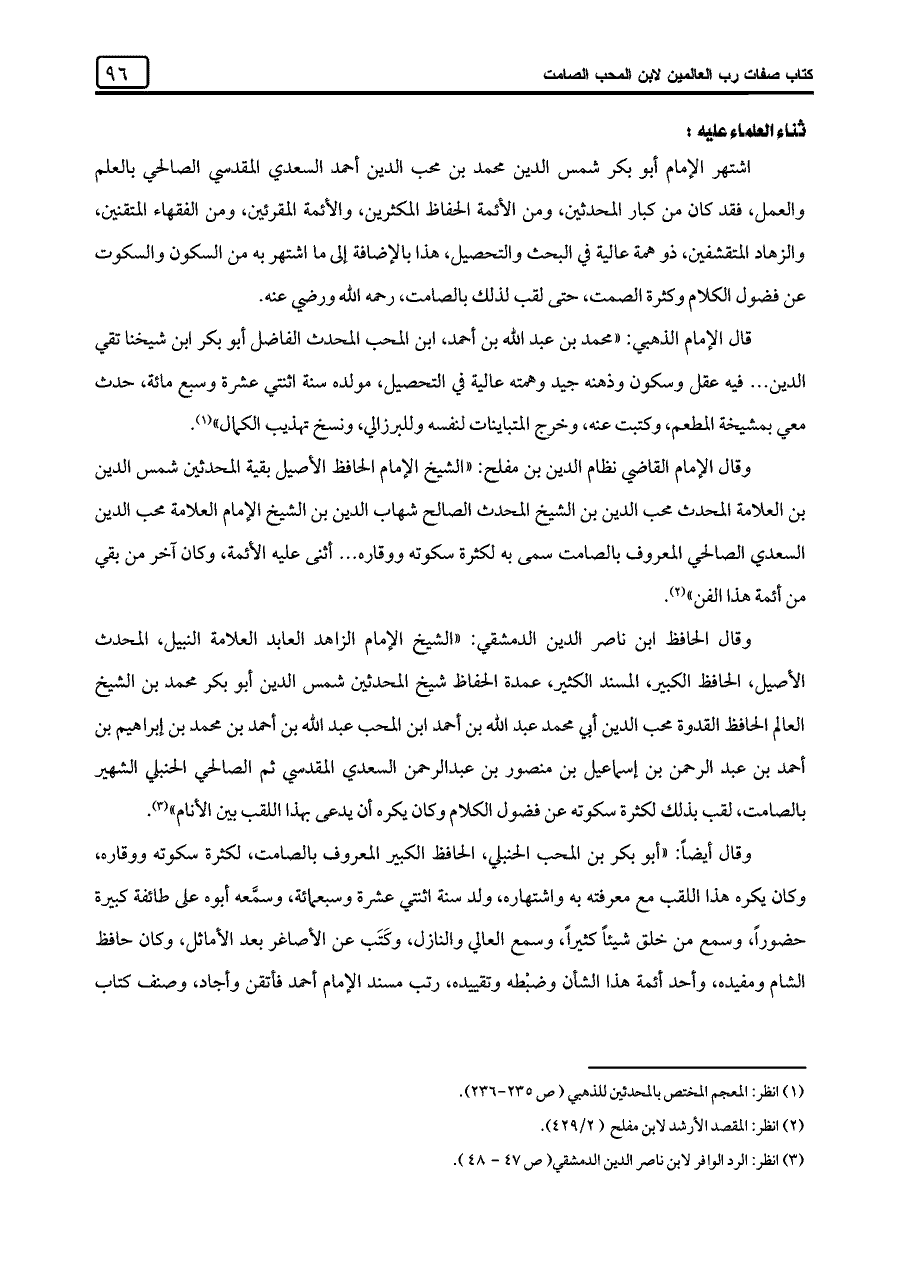 وقال الحافظ ابن ناصر الدين الدمشقي: "الشيخ الإمام الزاهد العابد العلامة النبيل، المحدث الأصيل، الحافظ الكبير، المسند الكثير، عمدة الحفاظ شيخ المحدثين شمس الدين أبو بكر محمد بن الشيخ العالم الحافظ القدوة محب الدين أبي محمد عبد اللَّه بن أحمد ابن المحب عبد اللَّه بن أحمد بن محمد بن إبراهيم بن أحمد بن عبد الرحمن بن إسماعيل بن منصور بن عبد الرحمن السعدي المقدسي ثم الصالحي الحنبلي الشهير بالصامت، لقب بذلك لكثرة سكوته عن فضول الكلام وكان يكره أن يدعي بهذا اللقب بين الأنام" (¬٣).