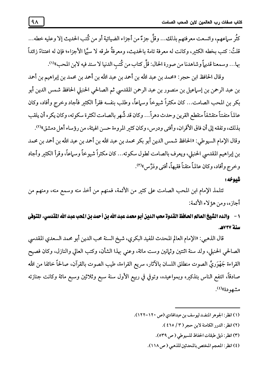 وقال الحافظ ابن حجر: "محمد بن عبد اللَّه بن أحمد بن عبد اللَّه بن أحمد بن محمد بن إبراهيم بن أحمد بن عبد الرحمن بن إسماعيل بن منصور بن عبد الرحمن المقدسي ثم الصالحي الحنبلي الحافظ شمس الدين أبو بكر بن المحب الصامت. . .كان مكثرًا شيوخا وسماعًا، وطلب بنفسه فقرأ الكثير فأجاد وخرج وأفاد، وكان عالمًا متفننًا متقشفًا منقطع القرين وحدث دهرًا. . .وكان قد شُهر بالصامت لكثرة سكوته، وكان يكره أن يلقب بذلك، وتفقه إلى أن فاق الأقران، وأفتي ودرس، وكان كثير المروءة حسن الهيئة، من رؤساء أهل دمشق" (¬٢).