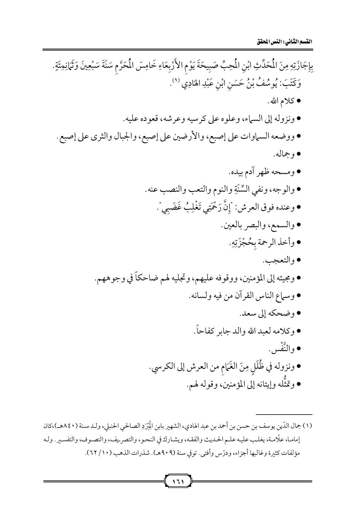 (¬١) جمال الدّين يوسف بن حسن بن أحمد بن عبد الهادي، الشهير بابن الْمِبْرَدِ الصالحي الحنبلي، ولد سنة (٨٤٠ هـ)، كان إماما، علّامة، يغلب عليه علم الحديث والفقه، ويشارك في النحو، والتصريف، والتصوف، والتفسير. وله مؤلفات كثيرة وغالبها أجزاء، ودرّس وأفتى. توفي سنة (٩٠٩ هـ). شذرات الذهب (١٠/ ٦٢).