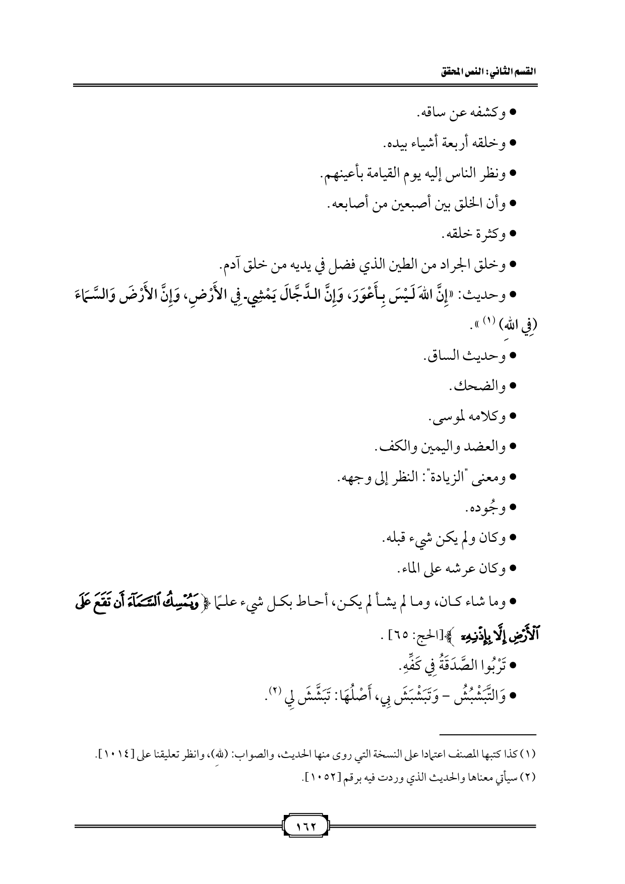 - وحديث: «إِنَّ اللهَ لَيْسَ بِأَعْوَرَ، وَإِنَّ الدَّجَّالَ يَمْشِي فِي الأَرْضِ، وَإِنَّ الأَرْضَ وَالسَّمَاءَ (فِي اللهِ) (¬١)».