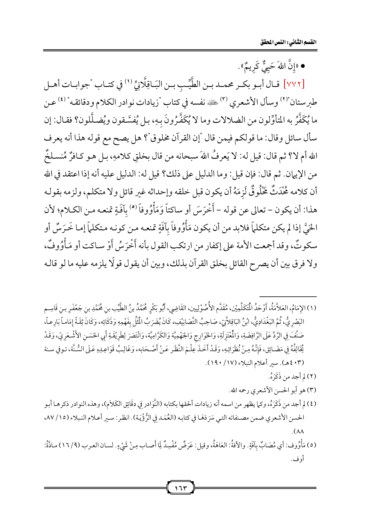 [٧٧٢] قال أبو بكر محمد بن الطَّيِّبِ بن البَاقِلَّانِيِّ (¬١) في كتاب "جوابات أهل طبرستان" (¬٢) وسأل الأشعري (¬٣) رحمه الله نفسه في كتاب "زيادات نوادر الكلام ودقائقه" (¬٤) عن ما يُكَفَّرُ به المتأوِّلون من الضلالات وما لا يُكَفَّرُونَ بِهِ، بل يُفسَّقون ويُضلَّلون؟ فقال: إن سأل سائل وقال: ما قولكم فيمن قال "إن القرآن مخلوق"؟ هل يصح مع قوله هذا أنه يعرف الله أم لا؟ ثم قال: قيل له: لا يَعرفُ اللهَ سبحانه من قال بخلقِ كلامهِ، بل هو كافرٌ مُنسلخٌ من الإيمان.
