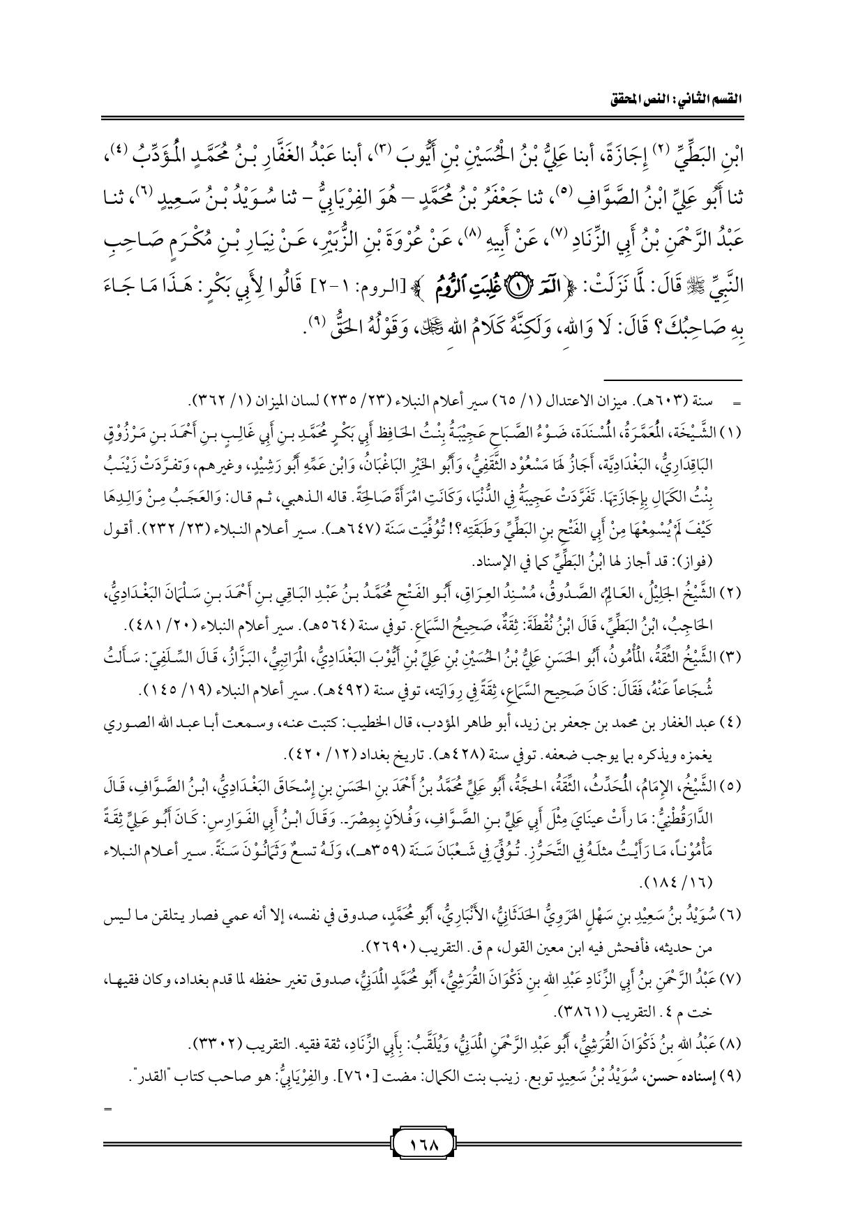 ابْنِ البَطِّيِّ (¬١) إِجَازَةً، أبنا عَلِيُّ بْنُ الْحُسَيْنِ بْنِ أَيُّوبَ (¬٢)، أبنا عَبْدُ الغَفَّارِ بْنُ مُحَمَّدٍ الْمُؤَدِّبُ (¬٣)، ثنا أَبُو عَلِيِّ ابْنُ الصَّوَّافِ (¬٤)، ثنا جَعْفَرُ بْنُ مُحَمَّدٍ - هُوَ الفِرْيَابِيُّ - ثنا سُوَيْدُ بْنُ سَعِيدٍ (¬٥)، ثنا عَبْدُ الرَّحْمَنِ بْنُ أَبِي الزِّنَادِ (¬٦)، عَنْ أَبِيهِ (¬٧)، عَنْ عُرْوَةَ بْنِ الزُّبَيْرِ، عَنْ نِيَارِ بْنِ مُكْرَمٍ صَاحِبِ النَّبِيِّ - صلى الله عليه وسلم - قَالَ: لَمَّا نَزَلَتْ: {الم (١) غُلِبَتِ الرُّومُ} [الروم: ١ - ٢] قَالُوا لِأَبِي بَكْرٍ: هَذَا مَا جَاءَ بِهِ صَاحِبُكَ؟ قَالَ: لَا وَاللهِ، وَلَكِنَّهُ كَلَامُ اللهِ - عز وجل -، وَقَوْلُهُ الحَقُّ (¬٨).