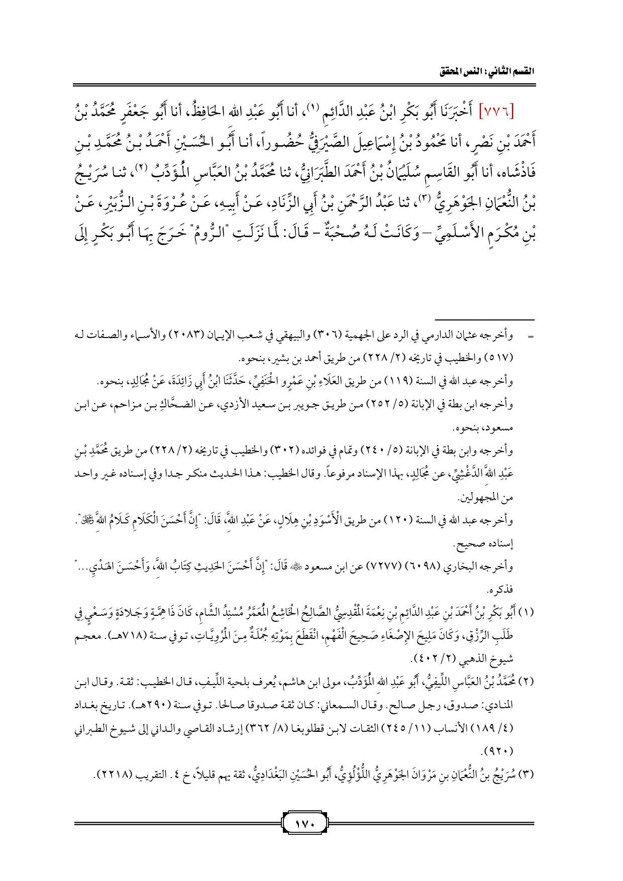 [٧٧٦] أَخْبَرَنَا أَبُو بَكْرِ ابْنُ عَبْدِ الدَّائِمِ (¬١)، أنا أَبُو عَبْدِ اللهِ الحَافِظُ، أنا أَبُو جَعْفَرٍ مُحَمَّدُ بْنُ أَحْمَدَ بْنِ نَصْرٍ، أنا مَحْمُودُ بْنُ إِسْمَاعِيلَ الصَّيْرَفِيُّ حُضُوراً، أنا أَبُو الحُسَيْنِ أَحْمَدُ بْنُ مُحَمَّدِ بْنِ فَاذْشَاه، أنا أَبُو القَاسِمِ سُلَيْمَانُ بْنُ أَحْمَدَ الطَّبَرَانِيُّ، ثنا مُحَمَّدُ بْنُ العَبَّاسِ الْمُؤَدِّبُ (¬٢)، ثنا سُرَيْجُ بْنُ النُّعْمَانِ الجَوْهَرِيُّ (¬٣)، ثنا عَبْدُ الرَّحْمَنِ بْنُ أَبِي الزِّنَادِ، عَنْ أَبِيهِ، عَنْ عُرْوَةَ بْنِ الزُّبَيْرِ، عَنْ بَيَان بْنِ مُكْرَمٍ الأَسْلَمِيِّ - وَكَانَتْ لَهُ صُحْبَةٌ - قَالَ: لَمَّا نَزَلَتِ "الرُّومُ" خَرَجَ بِهَا أَبُو بَكْرٍ إِلَى