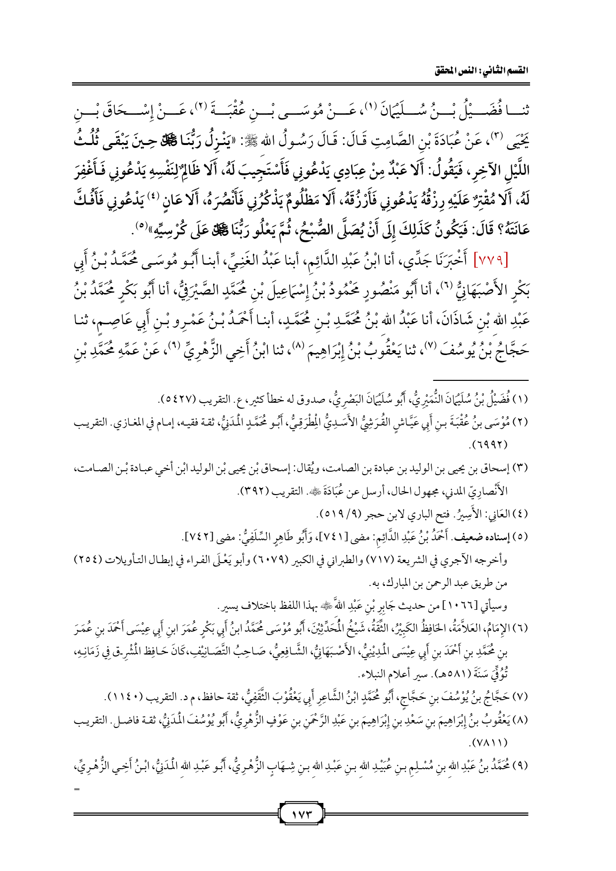 ثنا فُضَيْلُ بْنُ سُلَيْمَانَ (¬١)، عَنْ مُوسَى بْنِ عُقْبَةَ (¬٢)، عَنْ إِسْحَاقَ بْنِ يَحْيَى (¬٣)، عَنْ عُبَادَةَ بْنِ الصَّامِتِ قَالَ: قَالَ رَسُولُ اللهِ - صلى الله عليه وسلم -: «يَنْزِلُ رَبُّنَا - عز وجل - حِينَ يَبْقَى ثُلُثُ اللَّيْلِ الآخِرِ، فَيَقُولُ: أَلَا عَبْدٌ مِنْ عِبَادِي يَدْعُونِي فَأَسْتَجِيبَ لَهُ، أَلَا ظَالِمٌ لِنَفْسِهِ يَدْعُونِي فَأَغْفِرَ لَهُ، أَلَا مُقْتِرٌ عَلَيْهِ رِزْقُهُ يَدْعُونِي فَأَرْزُقَهُ، أَلَا مَظْلُومٌ يَذْكُرُنِي فَأَنْصُرَهُ، أَلَا عَانٍ (¬٤) يَدْعُونِي فَأَفُكَّ عَانَتَهُ؟ قَالَ: فَيَكُونُ كَذَلِكَ إِلَى أَنْ يُصَلَّى الصُّبْحُ، ثُمَّ يَعْلُو رَبُّنَا - عز وجل - عَلَى كُرْسِيِّهِ» (¬٥).