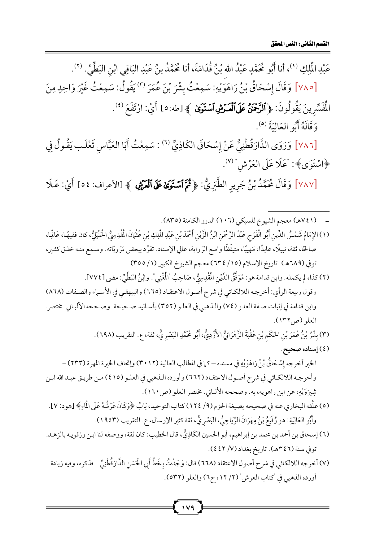 [٧٨٦] وَرَوَى الدَّارَقُطْنِيُّ عَنْ إِسْحَاقَ الكَاذِيِّ (¬٦): سَمِعْتُ أَبَا العَبَّاسِ ثَعْلَب يَقُولُ فِي {اسْتَوَى}: "عَلَا عَلَى العَرْشِ" (¬٧).