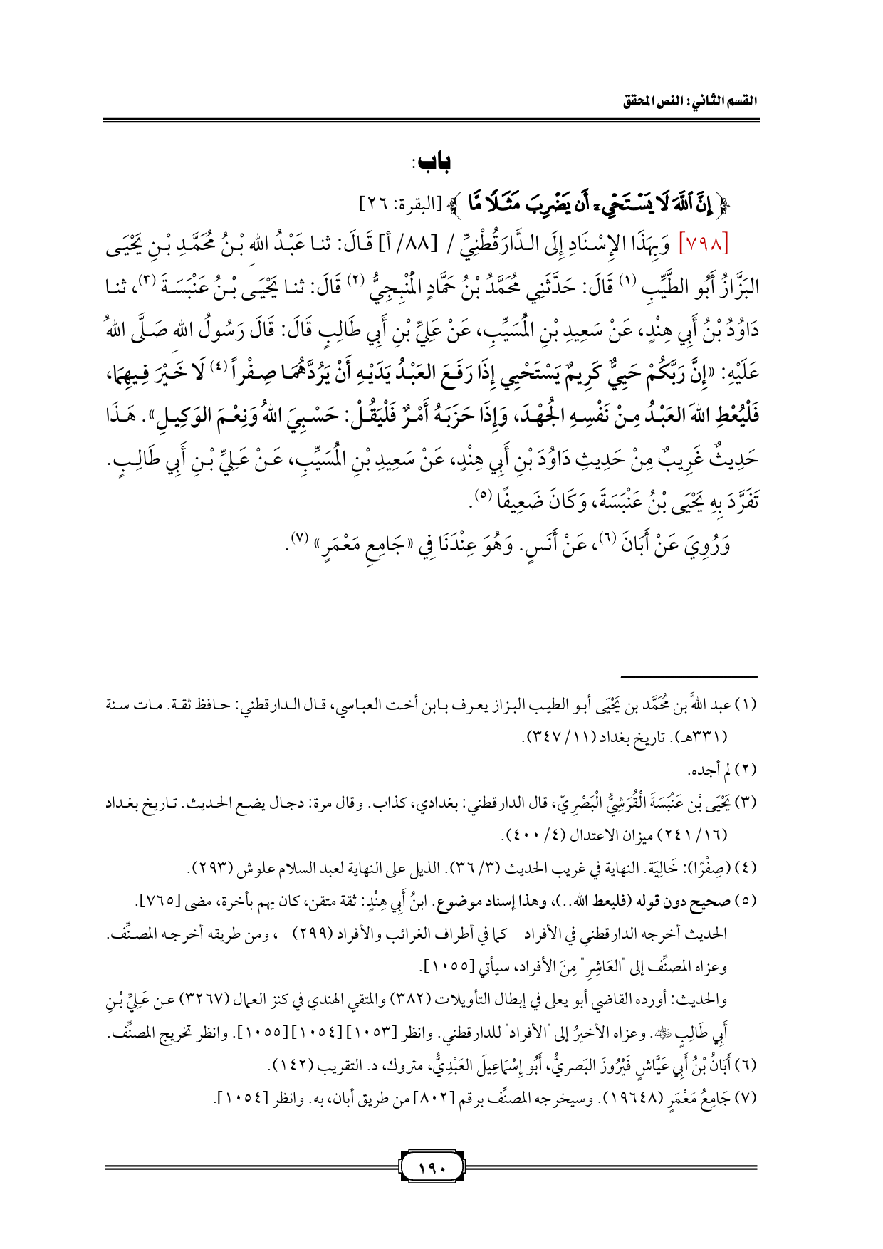 [٧٩٨] وَبِهَذَا الإِسْنَادِ إِلَى الدَّارَقُطْنِيِّ / [٨٨/أ] قَالَ: ثنا عَبْدُ اللهِ بْنُ مُحَمَّدِ بْنِ يَحْيَى البَزَّازُ أَبُو الطَّيِّبِ (¬١) قَالَ: حَدَّثَنِي مُحَمَّدُ بْنُ حَمَّادٍ الْمَنْبِجِيُّ (¬٢) قَالَ: ثنا يَحْيَى بْنُ عَنْبَسَةَ (¬٣)، ثنا دَاوُدُ بْنُ أَبِي هِنْدٍ، عَنْ سَعِيدِ بْنِ الْمُسَيِّبِ، عَنْ عَلِيِّ بْنِ أَبِي طَالِبٍ قَالَ: قَالَ رَسُولُ اللهِ صَلَّى اللهُ عَلَيْهِ: «إِنَّ رَبَّكُمْ حَيِيٌّ كَرِيمٌ يَسْتَحْيِي إِذَا رَفَعَ العَبْدُ يَدَيْهِ أَنْ يَرُدَّهُمَا صِفْراً (¬٤) لَا خَيْرَ فِيهِمَا، فَلْيُعْطِ اللهَ العَبْدُ مِنْ نَفْسِهِ الجُهْدَ، وَإِذَا حَزَبَهُ أَمْرٌ فَلْيَقُلْ: حَسْبِيَ اللهُ وَنِعْمَ الوَكِيلِ». هَذَا حَدِيثٌ غَرِيبٌ مِنْ حَدِيثِ دَاوُدَ بْنِ أَبِي هِنْدٍ، عَنْ سَعِيدِ بْنِ الْمُسَيِّبِ، عَنْ عَلِيِّ بْنِ أَبِي طَالِبٍ. تَفَرَّدَ بِهِ يَحْيَى بْنُ عَنْبَسَةَ، وَكَانَ ضَعِيفًا (¬٥).