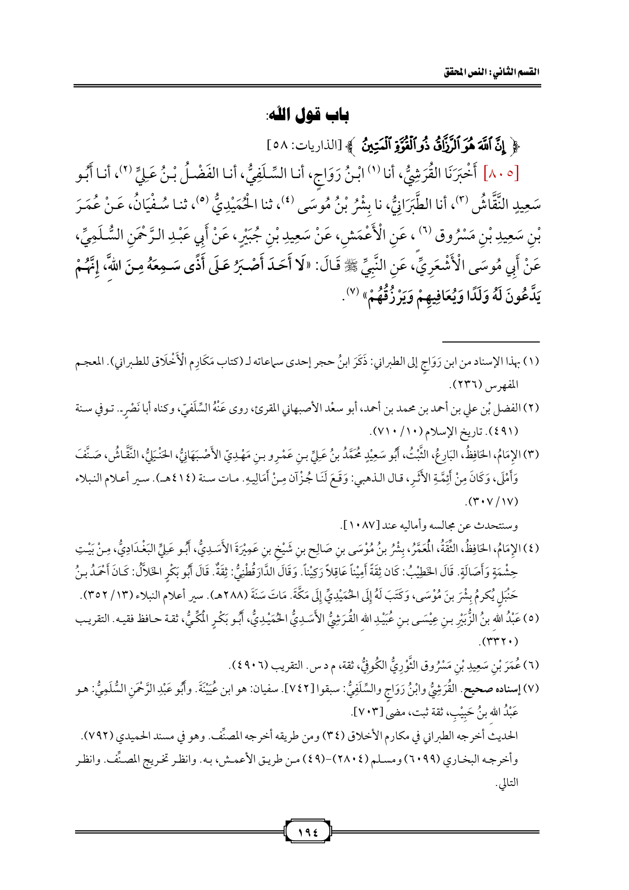[٨٠٥] أَخْبَرَنَا القُرَشِيُّ، أنا (¬١) ابْنُ رَوَاجٍ، أنا السِّلَفِيُّ، أنا الفَضْلُ بْنُ عَلِيٍّ (¬٢)، أنا أَبُو سَعِيدٍ النَّقَّاشُ (¬٣)، أنا الطَّبَرَانِيُّ، نا بِشْرُ بْنُ مُوسَى (¬٤)، ثنا الْحُمَيْدِيُّ (¬٥)، ثنا سُفْيَانُ، عَنْ عُمَرَ بْنِ سَعِيدِ بْنِ مَسْرُوق (¬٦)، عَنِ الْأَعْمَشِ، عَنْ سَعِيدِ بْنِ جُبَيْرٍ، عَنْ أَبِي عَبْدِ الرَّحْمَنِ السُّلَمِيِّ، عَنْ أَبِي مُوسَى الْأَشْعَرِيِّ، عَنِ النَّبِيِّ - صلى الله عليه وسلم - قَالَ: «لَا أَحَدَ أَصْبَرُ عَلَى أَذًى سَمِعَهُ مِنَ اللَّهِ، إِنَّهُمْ يَدَّعُونَ لَهُ وَلَدًا وَيُعَافِيهِمْ وَيَرْزُقُهُمْ» (¬٧).