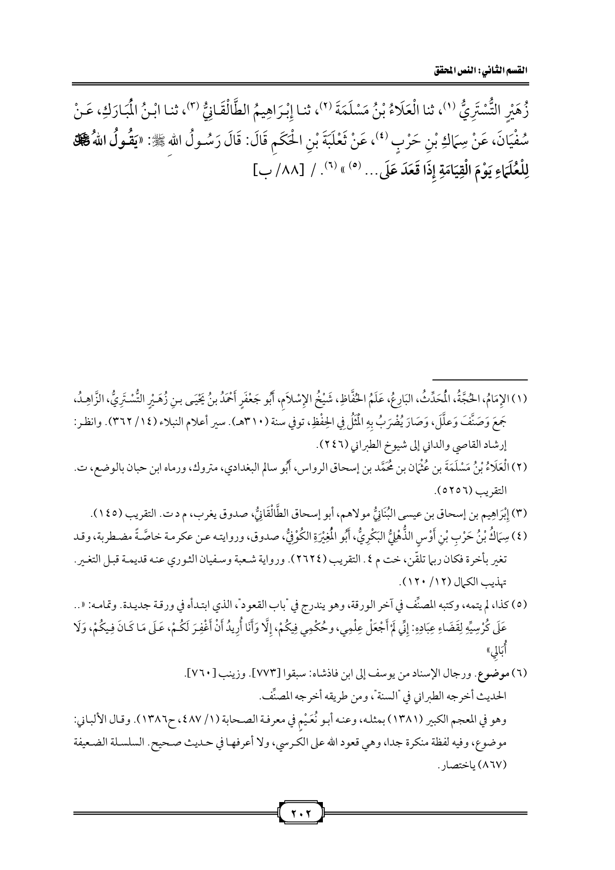 زُهَيْرٍ التُّسْتَرِيُّ (¬١)، ثنا الْعَلَاءُ بْنُ مَسْلَمَةَ (¬٢)، ثنا إِبْرَاهِيمُ الطَّالْقَانِيُّ (¬٣)، ثنا ابْنُ الْمُبَارَكِ، عَنْ سُفْيَانَ، عَنْ سِمَاكِ بْنِ حَرْبٍ (¬٤)، عَنْ ثَعْلَبَةَ بْنِ الْحَكَمِ قَالَ: قَالَ رَسُولُ اللهِ - صلى الله عليه وسلم -: «يَقُولُ اللهُ - عز وجل - لِلْعُلَمَاءِ يَوْمَ الْقِيَامَةِ إِذَا قَعَدَ عَلَى ... (¬٥)» (¬٦). / [٨٨/ب]