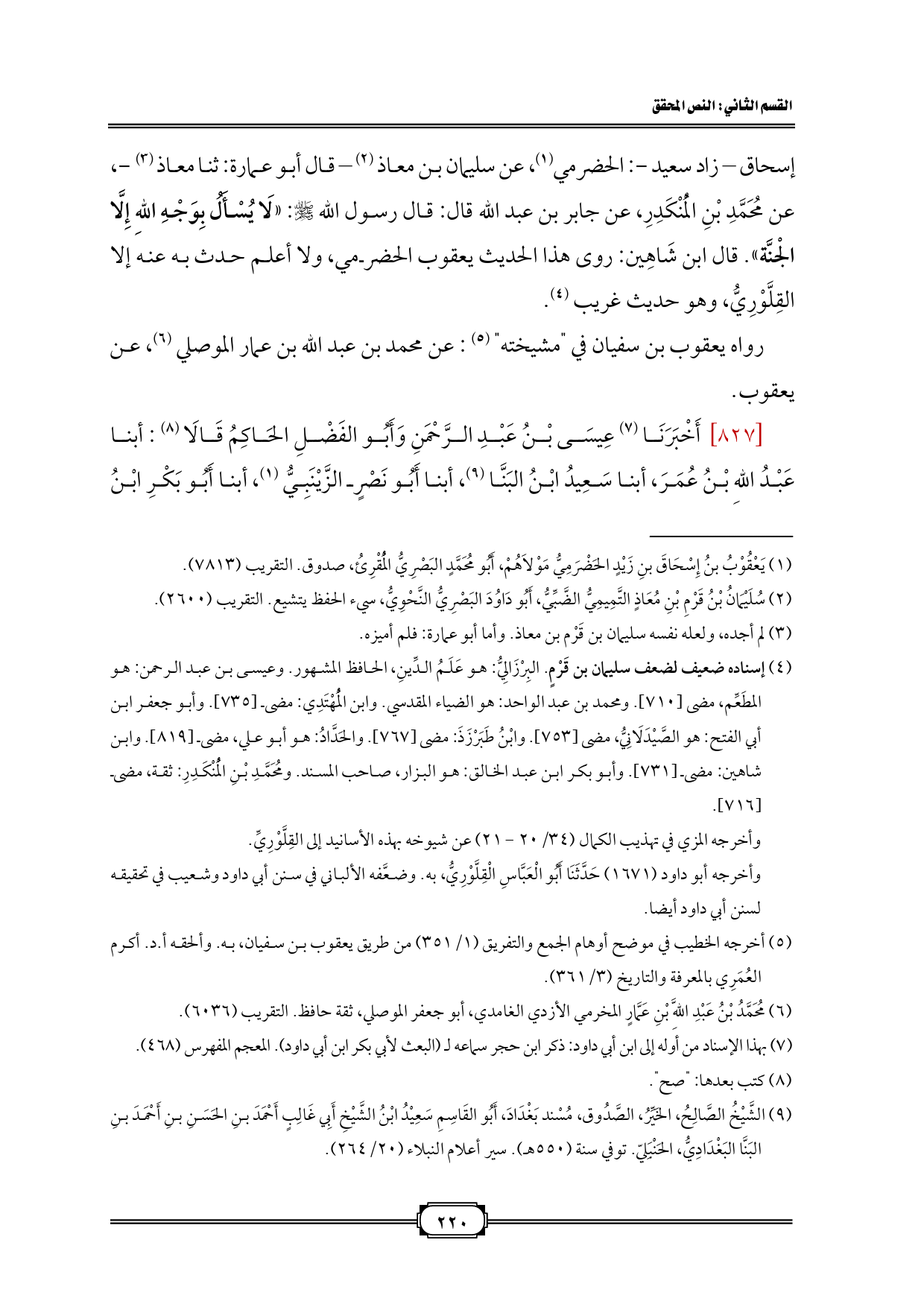 إسحاق - زاد سعيد -: الحضرمي (¬١)، عن سليمان بن معاذ (¬٢) - قال أبو عمارة: ثنا معاذ (¬٣) -، عن مُحَمَّدِ بْنِ الْمُنْكَدِرِ، عن جابر بن عبد الله قال: قال رسول الله - صلى الله عليه وسلم -: «لَا يُسْأَلُ بِوَجْهِ اللهِ إِلَّا الْجنَّة». قال ابن شَاهِين: روى هذا الحديث يعقوب الحضرمي، ولا أعلم حدث به عنه إلا القِلَّوْرِيُّ، وهو حديث غريب (¬٤).