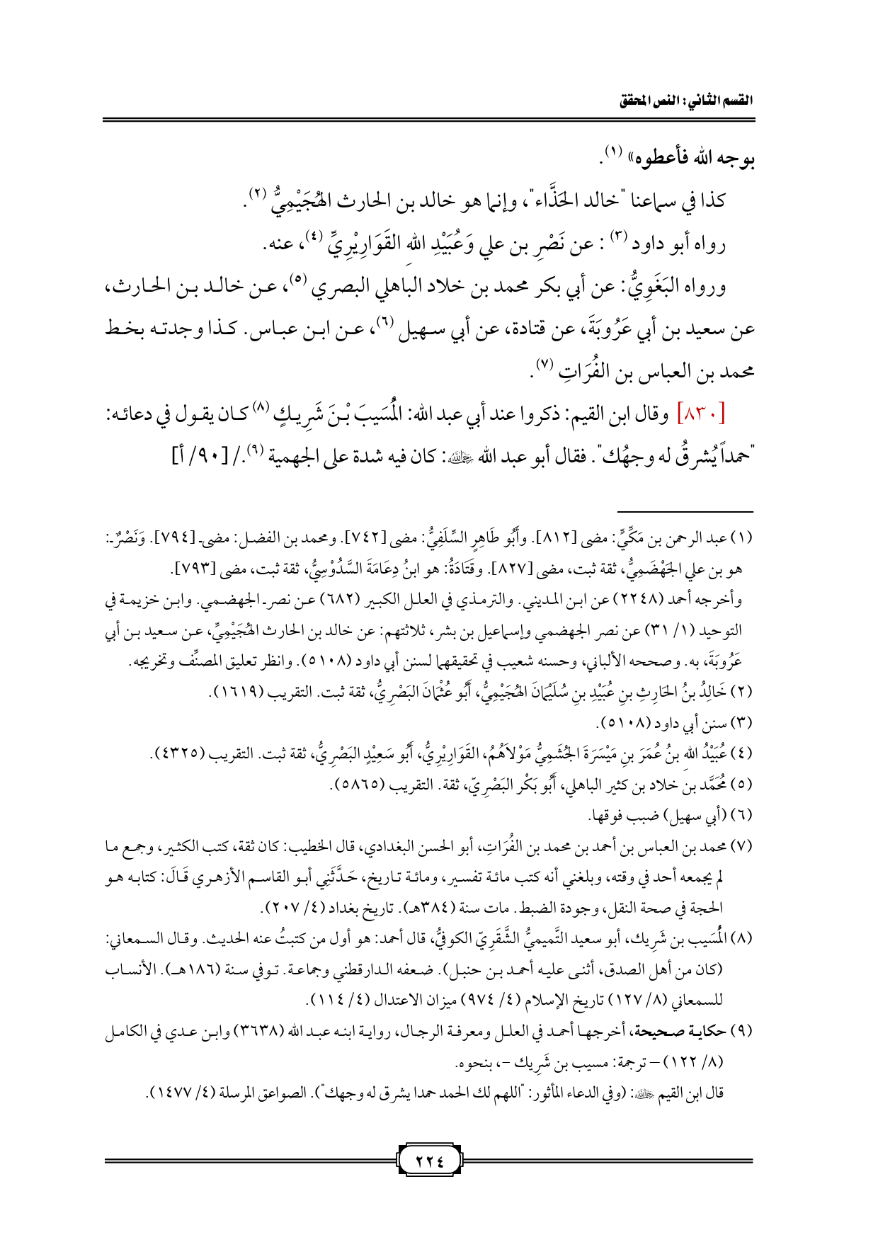 [٨٣٠] وقال ابن القيم: ذكروا عند أبي عبد الله: الْمُسَيبَ بْنَ شَرِيكٍ (¬٨) كان يقول في دعائه: "حمداً يُشرقُ له وجهُك". فقال أبو عبد الله رحمه الله: كان فيه شدة على الجهمية (¬٩)./ [٩٠/أ]