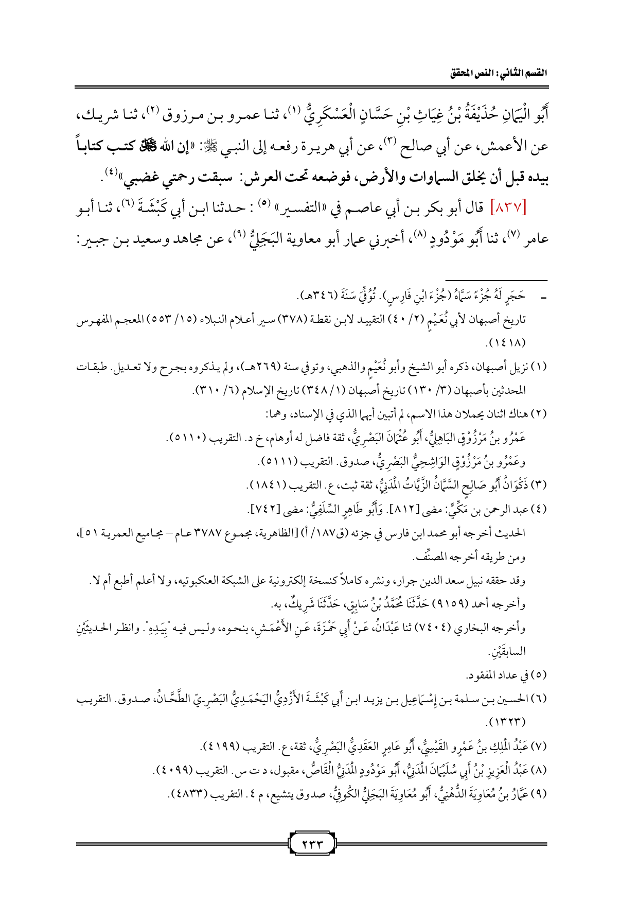 [٨٣٧] قال أبو بكر بن أبي عاصم في «التفسير» (¬٥): حدثنا ابن أبي كَبْشَةَ (¬٦)، ثنا أبو عامر (¬٧)، ثنا أَبُو مَوْدُودٍ (¬٨)، أخبرني عمار أبو معاوية البَجَلِيُّ (¬٩)، عن مجاهد وسعيد بن جبير: