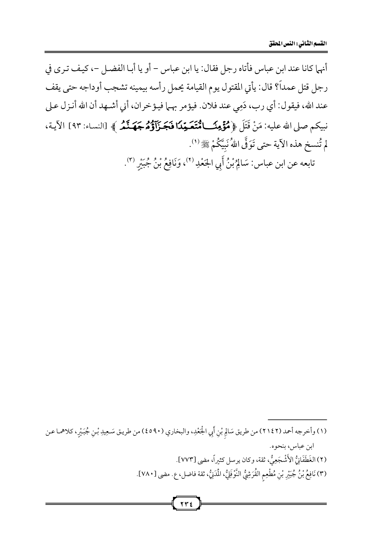 أنهما كانا عند ابن عباس فأتاه رجل فقال: يا ابن عباس - أو يا أبا الفضل -، كيف ترى في رجل قتل عمداً؟ قال: يأتي المقتول يوم القيامة يحمل رأسه بيمينه تشجب أوداجه حتى يقف عند الله، فيقول: أي رب، دَمِي عند فلان. فيؤمر بهما فيؤخران، أني أشهد أن الله أنزل على نبيكم صلى الله عليه: مَنْ قَتَلَ {مُؤْمِنًا مُتَعَمِّدًا فَجَزَاؤُهُ جَهَنَّمُ} [النساء: ٩٣] الآية، لم تُنسخ هذه الآية حتى تَوَفَّى اللهُ نَبِيَّكُمْ - صلى الله عليه وسلم - (¬١).