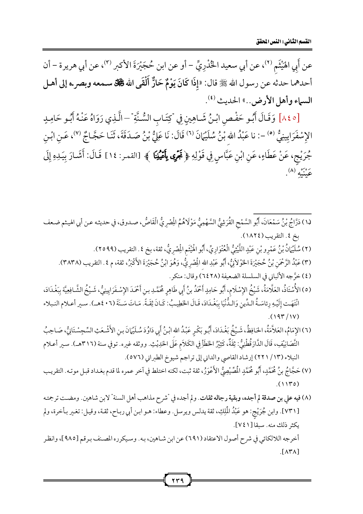 [٨٤٥] وَقَالَ أَبُو حَفْصِ ابْنُ شَاهِينٍ فِي "كِتَابِ السُّنَّةِ" - الَّذِي رَوَاهُ عَنْهُ أَبُو حَامِدٍ الإِسْفَرَايِينِيُّ (¬٤) -: نا عَبْدُ اللهِ بْنُ سُلَيْمَانَ (¬٥) قَالَ: نَا عَلِيُّ بْنُ صَدَقَةَ، ثَنَا حَجَّاجٌ (¬٦)، عَنِ ابْنِ جُرَيْجٍ، عَنْ عَطَاءٍ، عَنِ ابْنِ عَبَّاسٍ فِي قَوْلِهِ {تَجْرِي بِأَعْيُنِنَا} [القمر: ١٤] قَالَ: أَشَارَ بِيَدِهِ إِلَى عَيْنَيْهِ (¬٧).