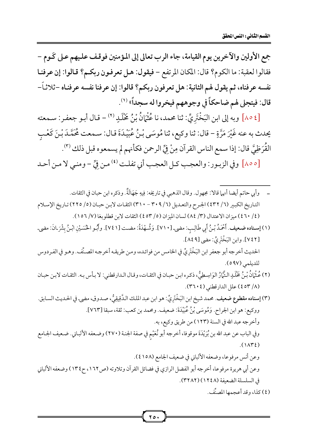 [٨٥٤] وبه إلى ابن البَخْتَرِيِّ: ثنا محمد، نا عُثْمَانُ بْنُ مَخْلَدٍ (¬٢) - قال أبو جعفر: سمعته يحدث به عنه غَيْرَ مَرَّةٍ - قال: ثنا وكيع، ثنا مُوسَى بْنُ عُبَيْدَةَ قال: سمعت مُحَمَّدَ بْنَ كَعْبٍ القُرَظِيَّ قال: إذا سمع الناس القرآن مِنْ فِيِّ الرحمن فكأنهم لم يسمعوه قبل ذلك (¬٣).