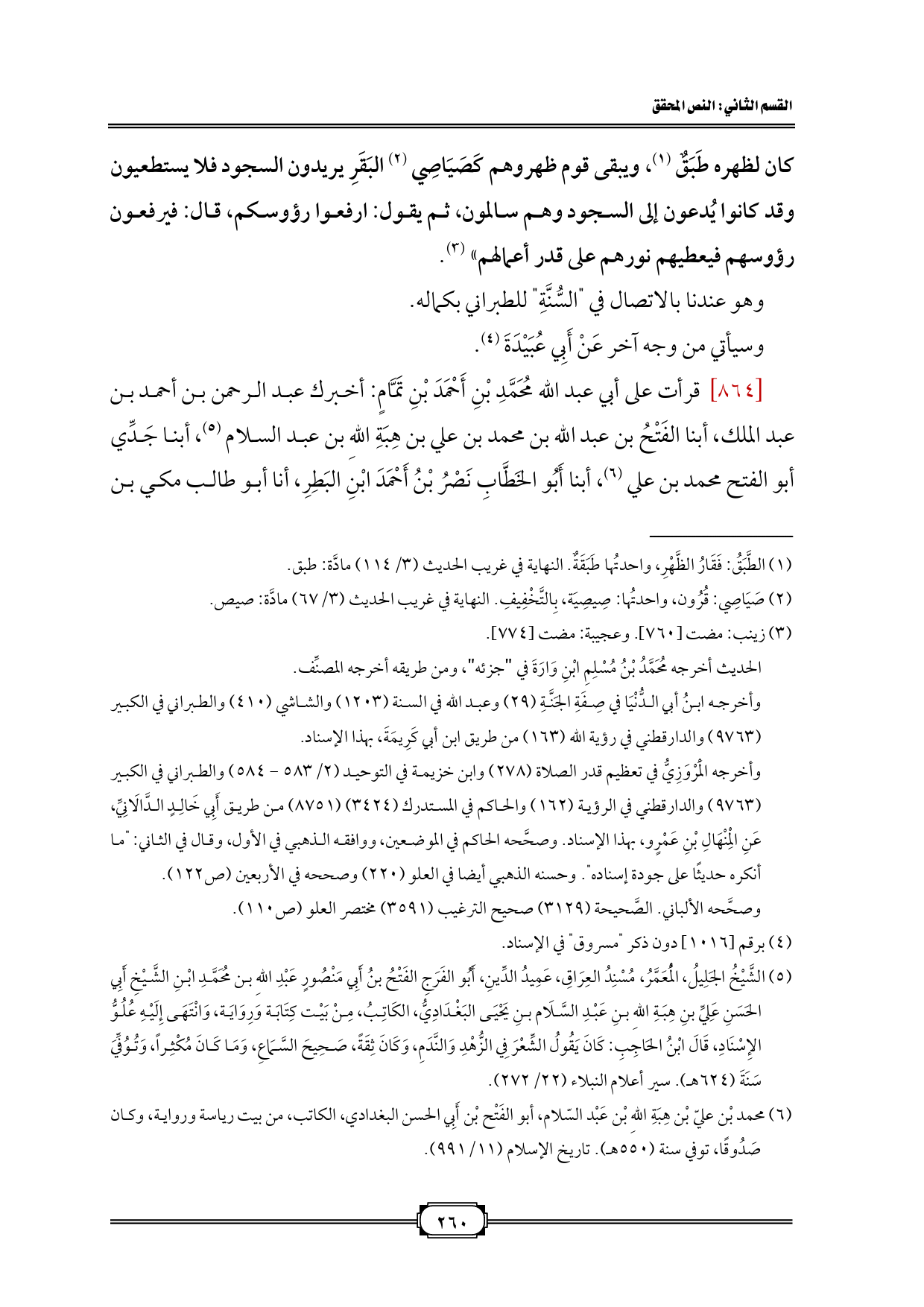 [٨٦٤] قرأت على أبي عبد الله مُحَمَّدِ بْنِ أَحْمَدَ بْنِ تَمَّامٍ: أخبرك عبد الرحمن بن أحمد بن عبد الملك، أبنا الفَتْحُ بن عبد الله بن محمد بن علي بن هِبَةِ اللهِ بن عبد السلام (¬٥)، أبنا جَدِّي أبو الفتح محمد بن علي (¬٦)، أبنا أَبُو الخَطَّابِ نَصْرُ بْنُ أَحْمَدَ ابْنِ البَطِرِ، أنا أبو طالب مكي بن