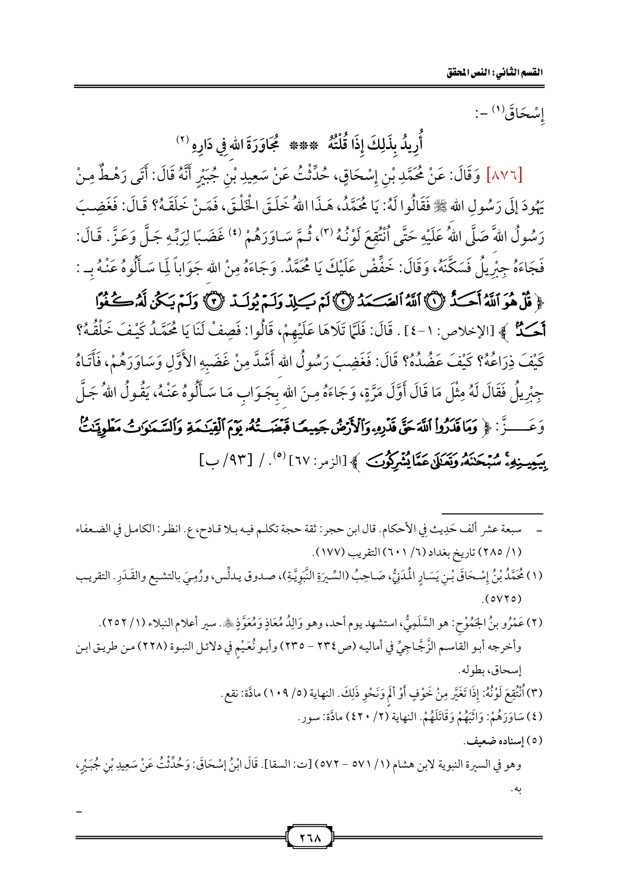 [٨٧٦] وَقَالَ: عَنْ مُحَمَّدِ بْنِ إِسْحَاقٍ، حُدِّثْتُ عَنْ سَعِيدِ بْنِ جُبَيْرٍ أَنَّهُ قَالَ: أَتَى رَهْطٌ مِنْ يَهُودَ إلَى رَسُولِ اللهِ - صلى الله عليه وسلم - فَقَالُوا لَهُ: يَا مُحَمَّدُ، هَذَا اللهُ خَلَقَ الْخَلْقَ، فَمَنْ خَلَقَهُ؟ قَالَ: فَغَضِبَ رَسُولُ اللَّهِ صَلَّى اللهُ عَلَيْهِ حَتَّى اُنْتُقِعَ لَوْنُهُ (¬٣)، ثُمَّ سَاوَرَهُمْ (¬٤) غَضَبًا لِرَبِّهِ جَلَّ وَعَزَّ. قَالَ: فَجَاءَهُ جِبْرِيلُ فَسَكَّنَهُ، وَقَالَ: خَفِّضْ عَلَيْكَ يَا مُحَمَّدُ. وَجَاءَهُ مِنْ اللهِ جَوَاباً لِمَا سَأَلُوهُ عَنْهُ بِـ: {قُلْ هُوَ اللَّهُ أَحَدٌ (١) اللَّهُ الصَّمَدُ (٢) لَمْ يَلِدْ وَلَمْ يُولَدْ (٣) وَلَمْ يَكُنْ لَهُ كُفُوًا أَحَدٌ} كَيْفَ ذِرَاعُهُ؟ كَيْفَ عَضُدُهُ؟ قَالَ: فَغَضِبَ رَسُولُ اللهِ أَشَدَّ مِنْ غَضَبِهِ الأَوَّلِ وَسَاوَرَهُمْ، فَأَتَاهُ جِبْرِيلُ فَقَالَ لَهُ مِثْلَ مَا قَالَ أَوَّلَ مَرَّةٍ، وَجَاءَهُ مِنَ اللهِ بِجَوَابِ مَا سَأَلُوهُ عَنْهُ، يَقُولُ اللهُ جَلَّ وَعَزَّ: {وَمَا قَدَرُوا اللَّهَ حَقَّ قَدْرِهِ وَالْأَرْضُ جَمِيعًا قَبْضَتُهُ يَوْمَ الْقِيَامَةِ وَالسَّمَاوَاتُ مَطْوِيَّاتٌ بِيَمِينِهِ سُبْحَانَهُ وَتَعَالَى عَمَّا يُشْرِكُونَ} [الزمر: ٦٧] (¬٥). / [٩٣/ب]