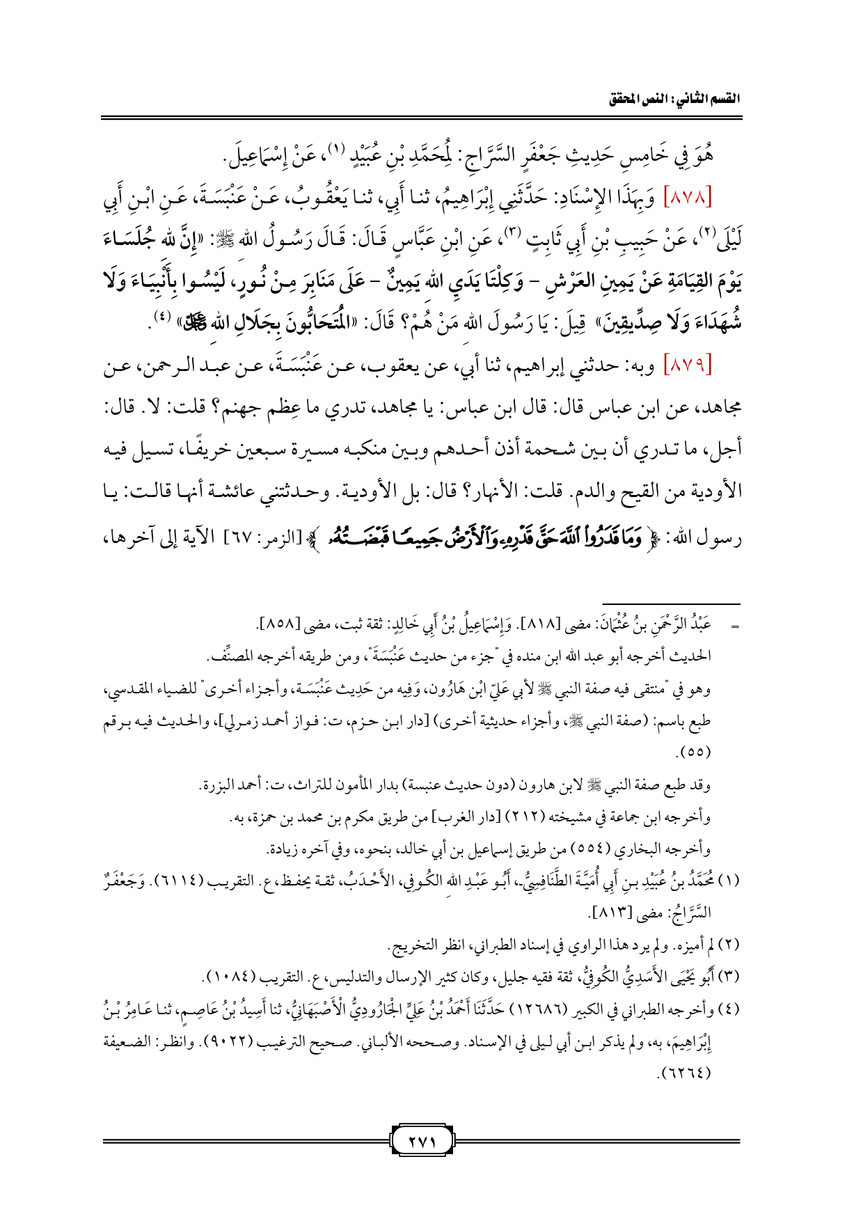 [٨٧٩] وبه: حدثني إبراهيم، ثنا أبي، عن يعقوب، عن عَنْبَسَةَ، عن عبد الرحمن، عن مجاهد، عن ابن عباس قال: قال ابن عباس: يا مجاهد، تدري ما عِظم جهنم؟ قلت: لا. قال: أجل، ما تدري أن بين شحمة أذن أحدهم وبين منكبه مسيرة سبعين خريفًا، تسيل فيه الأودية من القيح والدم. قلت: الأنهار؟ قال: بل الأودية. وحدثتني عائشة أنها قالت: يا رسول الله: {وَمَا قَدَرُوا اللَّهَ حَقَّ قَدْرِهِ وَالْأَرْضُ جَمِيعًا قَبْضَتُهُ} [الزمر: ٦٧] الآية إلى آخرها،