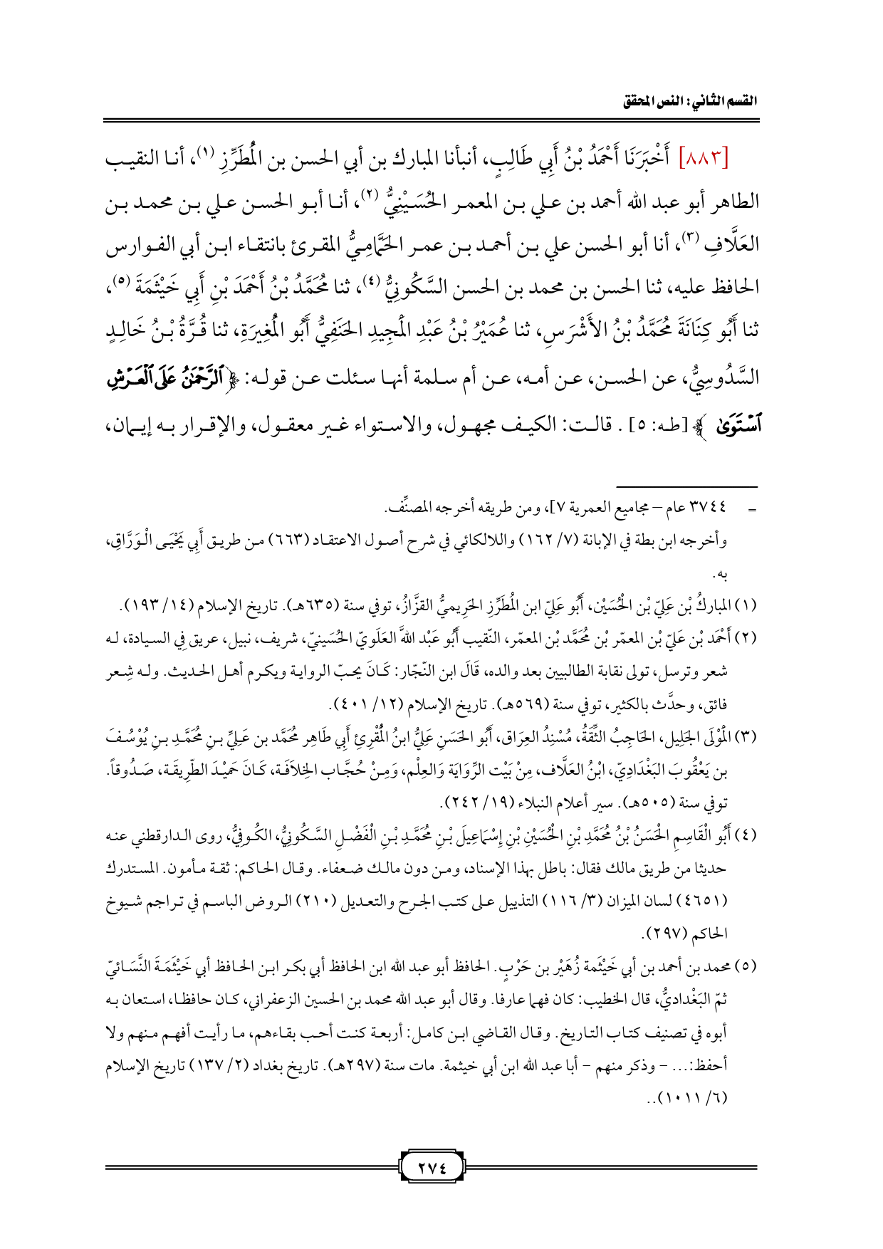 [٨٨٣] أَخْبَرَنَا أَحْمَدُ بْنُ أَبِي طَالِبٍ، أنبأنا المبارك بن أبي الحسن بن الْمُطَرِّزِ (¬١)، أنا النقيب الطاهر أبو عبد الله أحمد بن علي بن المعمر الحُسَيْنِيُّ (¬٢)، أنا أبو الحسن علي بن محمد بن العَلَّافِ (¬٣)، أنا أبو الحسن علي بن أحمد بن عمر الحَمَّامِيُّ المقرئ بانتقاء ابن أبي الفوارس الحافظ عليه، ثنا الحسن بن محمد بن الحسن السَّكُونِيُّ (¬٤)، ثنا مُحَمَّدُ بْنُ أَحْمَدَ بْنِ أَبِي خَيْثَمَةَ (¬٥)، ثنا أَبُو كِنَانَةَ مُحَمَّدُ بْنُ الأَشْرَسِ، ثنا عُمَيْرُ بْنُ عَبْدِ الْمَجِيدِ الحَنَفِيُّ أَبُو الْمُغِيرَةِ، ثنا قُرَّةُ بْنُ خَالِدٍ السَّدُوسِيُّ، عن الحسن، عن أمه، عن أم سلمة أنها سئلت عن قوله: {الرَّحْمَنُ عَلَى الْعَرْشِ اسْتَوَى} [طه: ٥]. قالت: الكيف مجهول، والاستواء غير معقول، والإقرار به إيمان،