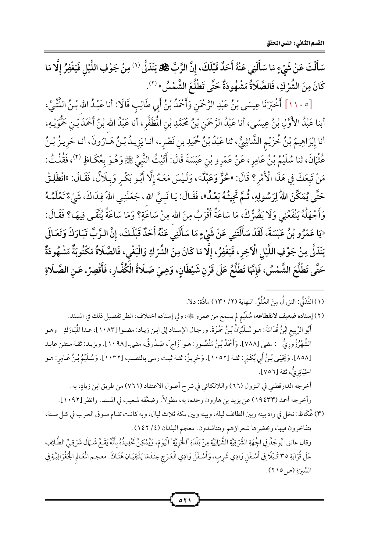 [١١٠٥] أَخْبَرَنَا عِيسَى بْنُ عَبْدِ الرَّحْمَنِ وَأَحْمَدُ بْنُ أَبِي طَالِبٍ قَالَا: أنا عَبْدُ اللهِ بْنُ اللَّتِّيِّ، أبنا عَبْدُ الأَوَّلِ بْنُ عِيسَى، أنا عَبْدُ الرَّحْمَنِ بْنُ مُحَمَّدِ بْنِ الْمُظَفَّرِ، أنا عَبْدُ اللهِ بْنُ أَحْمَدَ بْنِ حَمُّوَيْهِ، أنا إِبْرَاهِيمُ بْنُ خُزَيْمٍ الشَّاشِيُّ، ثنا عَبْدُ بْنُ حُمَيدِ بنِ نَصْرٍ، أنا يَزِيدُ بْنُ هَارُونَ، أنا حَرِيزُ بْنُ عُثْمَانَ، ثنا سُلَيْمُ بْنُ عَامِرٍ، عَنْ عَمْرِو بْنِ عَبَسَةَ قَالَ: أَتَيْتُ النَّبِيَّ - صلى الله عليه وسلم - وَهُوَ بِعُكَاظٍ (¬٣)، فَقُلْتُ: مَنْ تَبِعَكَ فِي هَذَا الْأَمْرِ؟ قَالَ: «حُرٌّ وَعَبْدٌ»، وَلَيْسَ مَعَهُ إِلَّا أَبُو بَكْرٍ وَبِلَالٌ، فَقَالَ: «انْطَلِقْ حَتَّى يُمَكِّنَ اللهُ لِرَسُولِهِ، ثُمَّ تَجِيئُهُ بَعْدُ»، فَقَالَ: يَا نَبِيَّ اللهِ، جَعَلَنِي اللهُ فِدَاكَ، شَيْءٌ تَعْلَمُهُ وَأَجْهَلُهُ يَنْفَعُنِي وَلَا يَضُرُّكَ، مَا سَاعَةٌ أَقْرَبُ مِنَ اللهِ مِنْ سَاعَةٍ؟ وَمَا سَاعَةٌ يُتَّقَى فِيهَا؟ فَقَالَ: «يَا عَمْرُو بْنُ عَبَسَةَ، لَقَدْ سَأَلْتَنِي عَنْ شَيْءٍ مَا سَأَلَنِي عَنْهُ أَحَدٌ قَبْلَكَ، إِنَّ الرَّبَّ تَبَارَكَ وَتَعَالَى يَتَدَلَّى مِنْ جَوْفِ اللَّيْلِ الْآخِرِ، فَيَغْفِرُ، إِلَّا مَا كَانَ مِنَ الشِّرْكِ وَالْبَغْيِ، فَالصَّلَاةُ مَكْتُوبَةٌ مَشْهُودَةٌ حَتَّى تَطْلُعَ الشَّمْسُ، فَإِنَّهَا تَطْلُعُ عَلَى قَرْنِ شَيْطَانٍ، وَهِيَ صَلَاةُ الْكُفَّارِ، فَأَقْصِرْ عَنِ الصَّلَاةِ