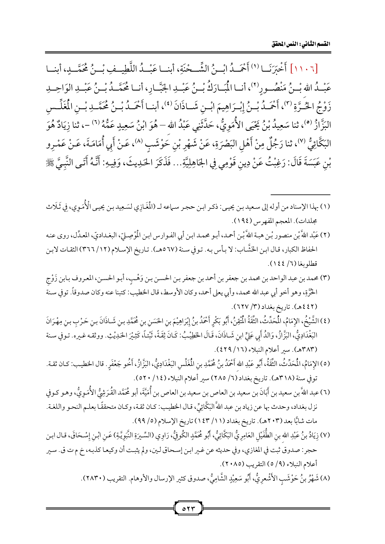 [١١٠٦] أَخْبَرَنَا (¬١) أَحْمَدُ ابْنُ الشِّحْنَةِ، أبنا عَبْدُ اللَّطِيفِ بْنُ مُحَمَّدٍ، أبنا عَبْدُ اللهِ بْنُ مَنْصُورٍ (¬٢)، أنا الْمُبَارَكُ بْنُ عَبْدِ الجَبَّارِ، أنا مُحَمَّدُ بْنُ عَبْدِ الوَاحِدِ زَوْجُ الحُرَّةِ (¬٣)، أَحْمَدُ بْنُ إِبْرَاهِيمَ ابْنِ شَاذَانَ (¬٤)، أبنا أَحْمَدُ بْنُ مُحَمَّدِ بْنِ الْمُغَلِّسِ البَزَّازُ (¬٥)، ثنا سَعِيدُ بْنُ يَحْيَى الأُمَوِيُّ، حَدَّثَنِي عَبْدُ اللهِ - هُوَ ابْنُ سَعِيدٍ عَمُّهُ (¬٦) -، ثنا زِيَادٌ هُوَ البَكَّائِيُّ (¬٧)، ثنا رَجُلٌ مِنْ أَهْلِ البَصْرَةِ، عَنْ شَهْرِ بْنِ حَوْشَبٍ (¬٨)، عَنْ أَبِي أُمَامَةَ، عَنْ عَمْرِو بْنِ عَبَسَةَ قَالَ: رَغِبْتُ عَنْ دِينِ قَوْمِي فِي الجَاهِلِيَّةِ ... فَذَكَرَ الحَدِيثَ، وَفِيهِ: أَنَّهُ أَتَى النَّبِيَّ - صلى الله عليه وسلم -