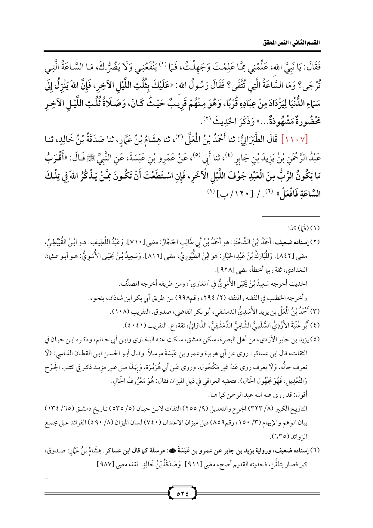 [١١٠٧] قَالَ الطَّبَرَانِيُّ: ثنا أَحْمَدُ بْنُ الْمُعَلَّى (¬٣)، ثنا هِشَامُ بْنُ عَمَّارٍ، ثنا صَدَقَةُ بْنُ خَالِدٍ، ثنا عَبْدُ الرَّحْمَنِ بْنُ يَزِيدَ بْنِ جَابِرٍ (¬٤)، ثنا أَبِي (¬٥)، عَنْ عَمْرِو بْنِ عَبَسَةَ، عَنِ النَّبِيِّ - صلى الله عليه وسلم - قَالَ: «أَقْرَبُ مَا يَكُونُ الرَّبُّ مِنَ الْعَبْدِ جَوْفَ اللَّيْلِ الْآخَرِ، فَإِنِ اسْتَطَعْتَ أَنْ تَكُونَ مِمَّنْ يَذْكُرُ اللهَ فِي تِلْكَ السَّاعَةِ فَافْعَلْ» (¬٦). / [١٢٠/ب] (¬٧)
