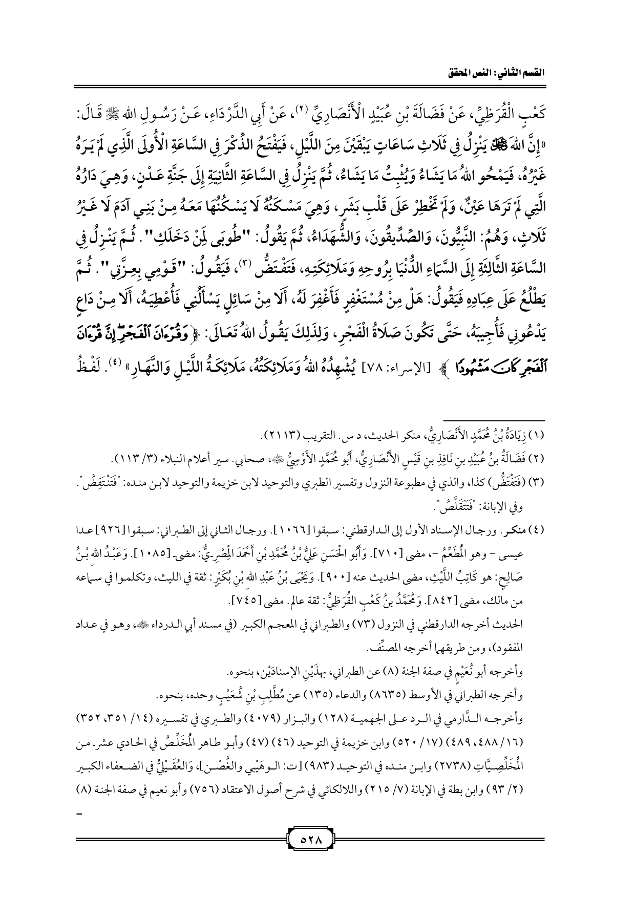 كَعْبٍ الْقُرَظِيِّ، عَنْ فَضَالَةَ بْنِ عُبَيْدٍ الْأَنْصَارِيِّ (¬١)، عَنْ أَبِي الدَّرْدَاءِ، عَنْ رَسُولِ اللهِ - صلى الله عليه وسلم - قَالَ: «إِنَّ اللهَ - عز وجل - يَنْزِلُ فِي ثَلَاثِ سَاعَاتٍ يَبْقَيْنَ مِنَ اللَّيْلِ، فَيَفْتَحُ الذِّكْرَ فِي السَّاعَةِ الْأُولَى الَّذِي لَمْ يَرَهُ غَيْرُهُ، فَيَمْحُو اللهُ مَا يَشَاءُ وَيُثْبِتُ مَا يَشَاءُ، ثُمَّ يَنْزِلُ فِي السَّاعَةِ الثَّانِيَةِ إِلَى جَنَّةِ عَدْنٍ، وَهِيَ دَارُهُ الَّتِي لَمْ تَرَهَا عَيْنٌ، وَلَمْ تَخْطِرْ عَلَى قَلْبِ بَشَرٍ، وَهِيَ مَسْكَنُهُ لَا يَسْكُنُهَا مَعَهُ مِنْ بَنِي آدَمَ لَا غَيْرُ ثَلَاثٍ، وَهُمُ: النَّبِيُّونَ، وَالصِّدِّيقُونَ، وَالشُّهَدَاءُ، ثُمَّ يَقُولُ: "طُوبَى لِمَنْ دَخَلَكِ". ثُمَّ يَنْزِلُ فِي السَّاعَةِ الثَّالِثَةِ إِلَى السَّمَاءِ الدُّنْيَا بِرُوحِهِ وَمَلَائِكَتِهِ، فَتَفْتَضُّ (¬٢)، فَيَقُولُ: "قَوْمِي بِعِزَّتِي". ثُمَّ يَطْلُعُ عَلَى عِبَادِهِ فَيَقُولُ: هَلْ مِنْ مُسْتَغْفِرٍ فَأَغْفِرَ لَهُ، أَلَا مِنْ سَائِلٍ يَسْأَلُنِي فَأُعْطِيَهُ، أَلَا مِنْ دَاعٍ يَدْعُونِي فَأُجِيبَهُ، حَتَّى تَكُونَ صَلَاةُ الْفَجْرِ، وَلِذَلِكَ يَقُولُ اللهُ تَعَالَى: {وَقُرْآنَ الْفَجْرِ إِنَّ قُرْآنَ الْفَجْرِ كَانَ مَشْهُودًا} [الإسراء: ٧٨] يُشْهِدُهُ اللهُ وَمَلَائِكَتُهُ، مَلَائِكَةُ اللَّيْلِ وَالنَّهَارِ» (¬٣). لَفْظُ