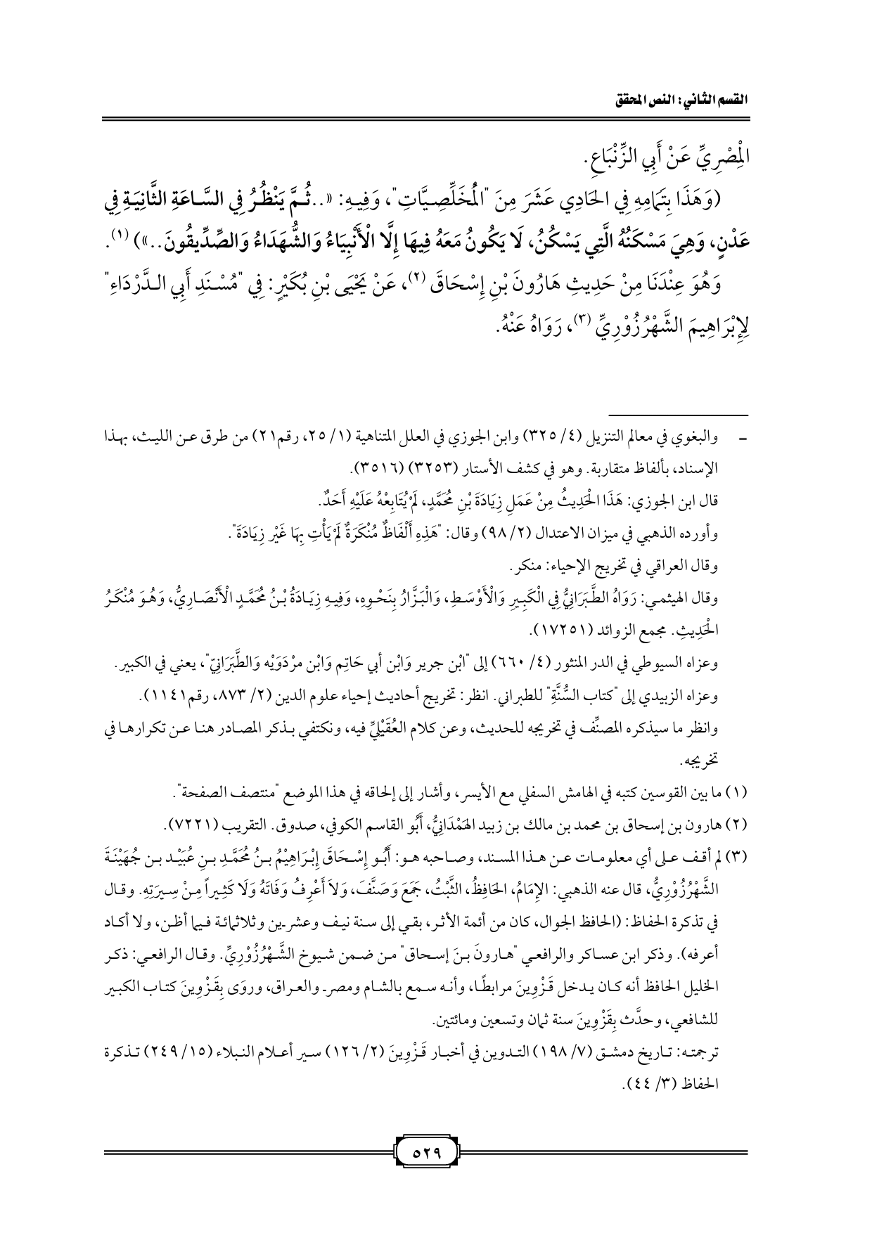 (¬٣) لم أقف على أي معلومات عن هذا المسند، وصاحبه هو: أَبُو إِسْحَاقَ إِبْرَاهِيْمُ بنُ مُحَمَّدِ بنِ عُبَيْد بن جُهَيْنَةَ الشَّهْرُزُوْرِيُّ، قال عنه الذهبي: الإِمَامُ، الحَافِظُ، الثَّبْتُ، جَمَعَ وَصَنَّفَ، وَلَا أَعْرِفُ وَفَاتَهُ وَلَا كَثِيراً مِنْ سِيرَتِهِ. وقال في تذكرة الحفاظ: (الحافظ الجوال، كان من أئمة الأثر، بقي إلى سنة نيف وعشرين وثلاثمائة فيما أظن، ولا أكاد أعرفه). وذكر ابن عساكر والرافعي "هارونَ بنَ إسحاق" من ضمن شيوخ الشَّهْرُزُوْرِيِّ. وقال الرافعي: ذكر الخليل الحافظ أنه كان يدخل قَزْوِينَ مرابطًا، وأنه سمع بالشام ومصر والعراق، وروَى بِقَزْوِينَ كتاب الكبير للشافعي، وحدَّث بِقَزْوِينَ سنة ثمان وتسعين ومائتين.
