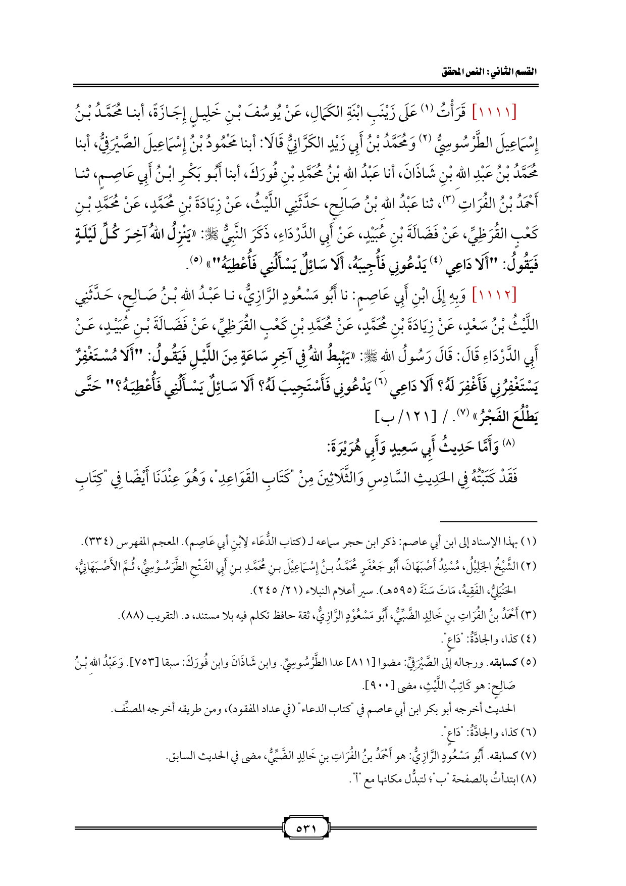 [١١١١] قَرَأْتُ (¬١) عَلَى زَيْنَبِ ابْنَةِ الكَمَالِ، عَنْ يُوسُفَ بْنِ خَلِيلٍ إِجَازَةً، أبنا مُحَمَّدُ بْنُ إِسْمَاعِيلَ الطَّرْسُوسِيُّ (¬٢) وَمُحَمَّدُ بْنُ أَبِي زَيْدٍ الكَرَّانِيُّ قَالَا: أبنا مَحْمُودُ بْنُ إِسْمَاعِيلَ الصَّيْرَفِيُّ، أبنا مُحَمَّدُ بْنُ عَبْدِ اللهِ بْنِ شَاذَانَ، أنا عَبْدُ اللهِ بْنُ مُحَمَّدِ بْنِ فُورَكَ، أبنا أَبُو بَكْرِ ابْنُ أَبِي عَاصِمٍ، ثنا أَحْمَدُ بْنُ الفُرَاتِ (¬٣)، ثنا عَبْدُ اللهِ بْنُ صَالِحٍ، حَدَّثَنِي اللَّيْثُ، عَنْ زِيَادَةَ بْنِ مُحَمَّدٍ، عَنْ مُحَمَّدِ بْنِ كَعْبٍ القُرَظِيِّ، عَنْ فَضَالَةَ بْنِ عُبَيْدٍ، عَنْ أَبِي الدَّرْدَاءِ، ذَكَرَ النَّبِيُّ - صلى الله عليه وسلم -: «يَنْزِلُ اللهُ آخِرَ كُلِّ لَيْلَةٍ فَيَقُولُ: "أَلَا دَاعِي (¬٤) يَدْعُونِي فَأُجِيبَهُ، أَلَا سَائِلٌ يَسْأَلُنِي فَأُعْطِيَهُ"» (¬٥).