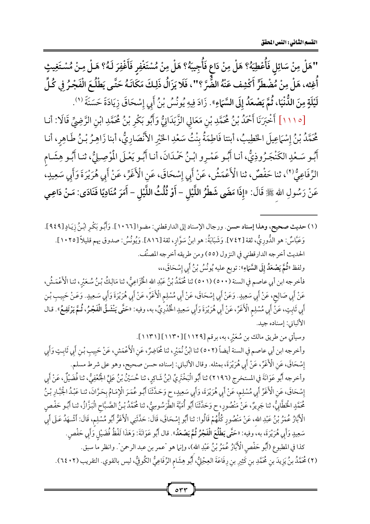 "هَلْ مِنْ سَائِلٍ فَأُعْطِيَهُ؟ هَلْ مِنْ دَاعٍ فَأُجِيبَهُ؟ هَلْ مِنْ مُسْتَغْفِرٍ فَأَغْفِرَ لَهُ؟ هَلْ مِنْ مُسْتَغِيثٍ أُغِثه، هَلْ مِنْ مُضْطَرٍّ أَكْشِف عَنْهُ الضُّرَّ؟ "، فَلَا يَزَالُ ذَلِكَ مَكَانَهُ حَتَّى يَطْلُعَ الْفَجْرُ فِي كُلِّ لَيْلَةٍ مِنَ الدُّنْيَا، ثُمَّ يَصْعَدُ إِلَى السَّمَاءِ». زَادَ فِيهِ يُونُسُ بْنُ أَبِي إِسْحَاقَ زِيَادَةً حَسَنَةً (¬١).